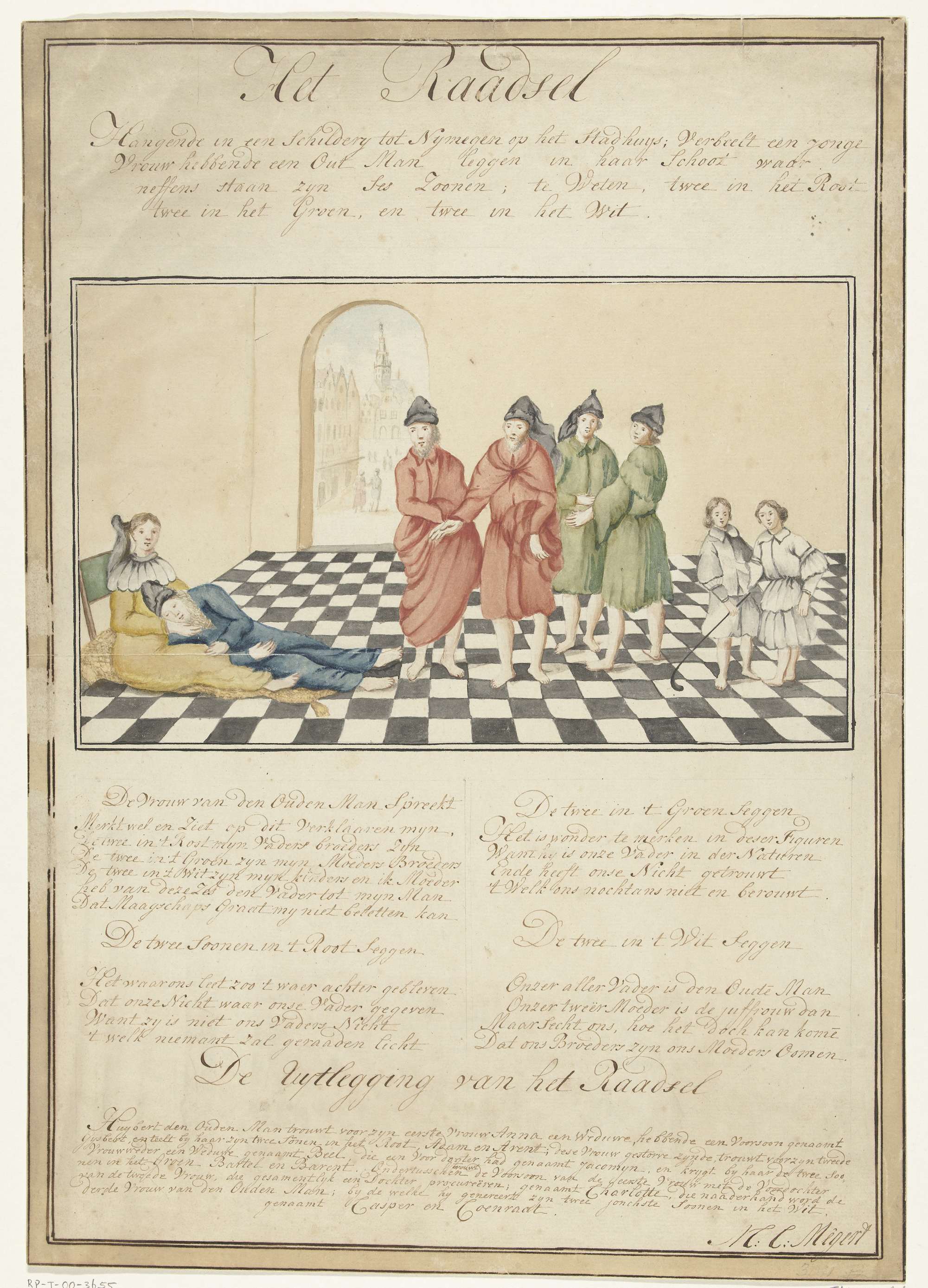 Het Nijmeegse Raadsel of het Gecompliceerde Huwelijk, 1619. Schilderij hangende op het raadhuis van Nijmegen met een familieportret met ingewikkelde relaties afkomstig uit een huwelijk aldaar gesloten in 1619. Met vier verzen en het uitleg van de raadsel op het blad onder de voorstelling.