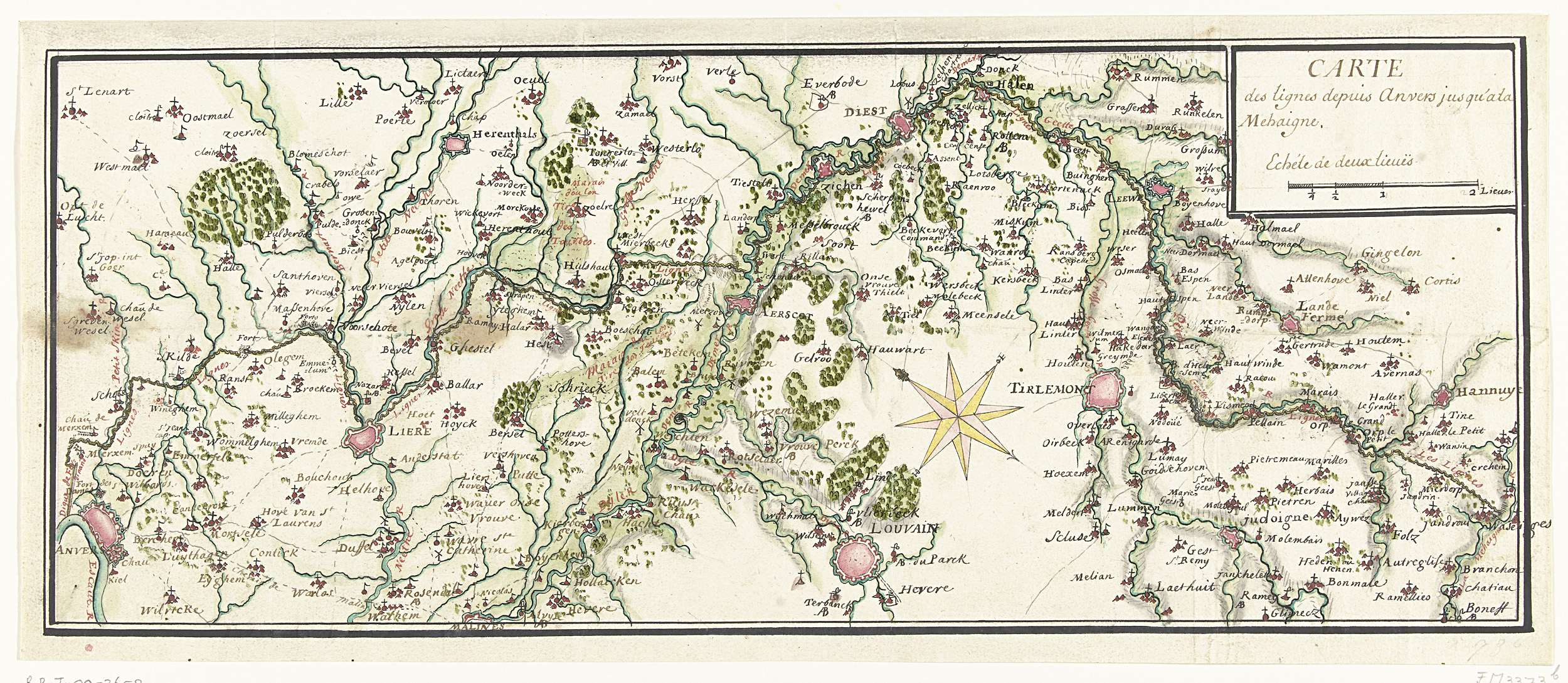 Getekende kaart van de Franse linies in Brabant strekkend van Antwerpen tot aan de rivier Mehaigne, ca. 1705. Mogelijk het origineel van de hertog van Marlborough en waarnaar de prent is gemaakt, maar waarschijnlijk een kopie. Titel en opschriften in het Frans.