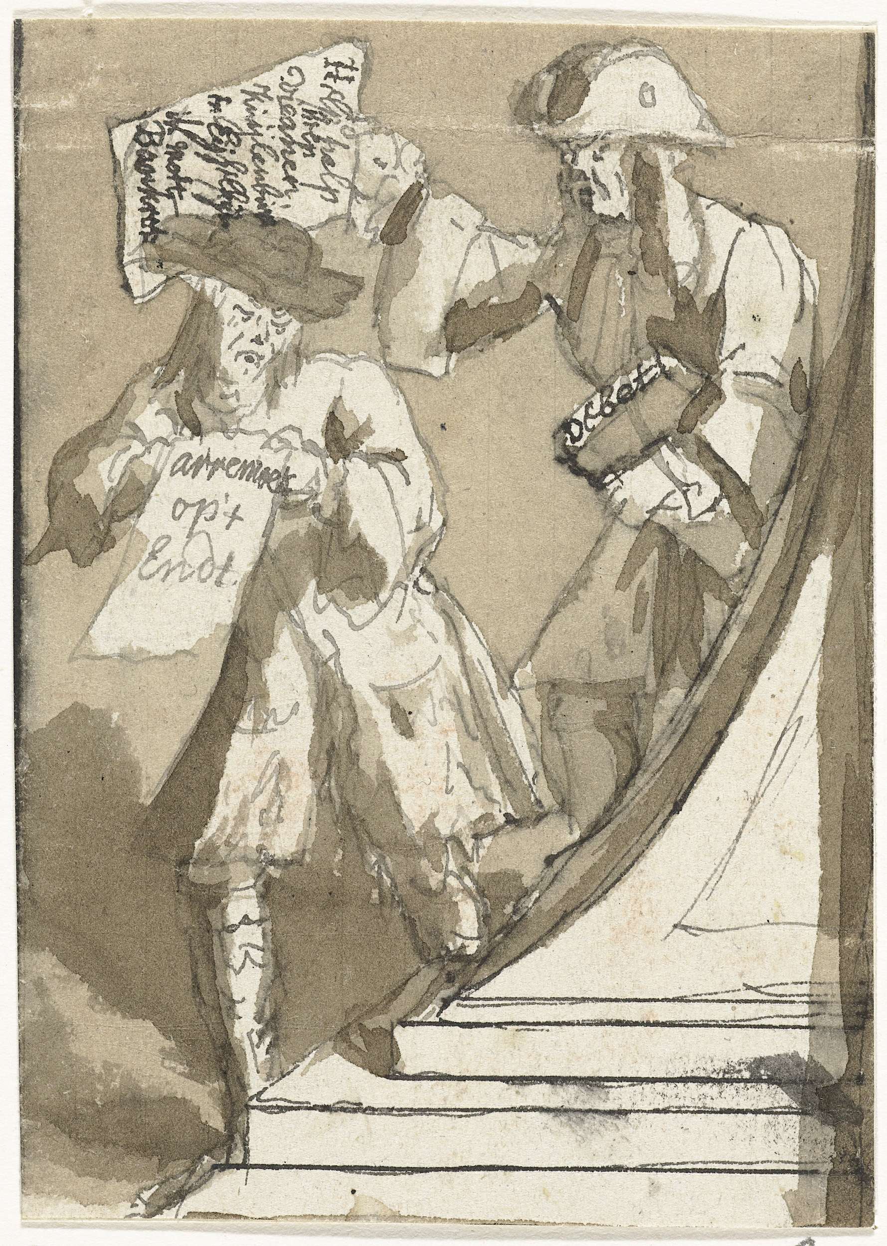 Uitgeknipt blad met het getekende ontwerp voor de voorstelling van de schuldeiser en armoedzaaier, onderdeel van de prent met de Op- en Ondergang van de Actionisten. Ontwerp voor een onderdeel van prent 7 in de serie Het Groote Tafereel der Dwaasheid met spotprenten op de Windhandel of Actiehandel van 1720. Ontwerp voor een prent.