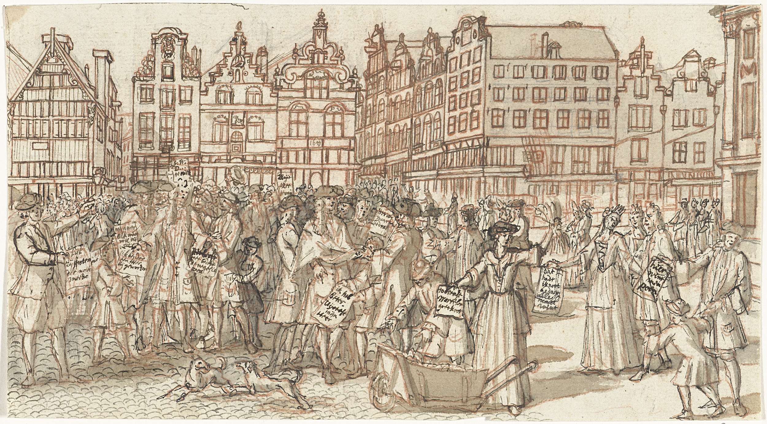 Uitgeknipt blad met het getekende ontwerp voor de voorstelling van de menigte slachtoffers van de windhandel verzameld op de Dam bij de Kalverstraatschuldeiser, onderdeel van de prent met de Op- en Ondergang van de Actionisten. Ontwerp voor een onderdeel van prent 7 in de serie Het Groote Tafereel der Dwaasheid met spotprenten op de Windhandel ...