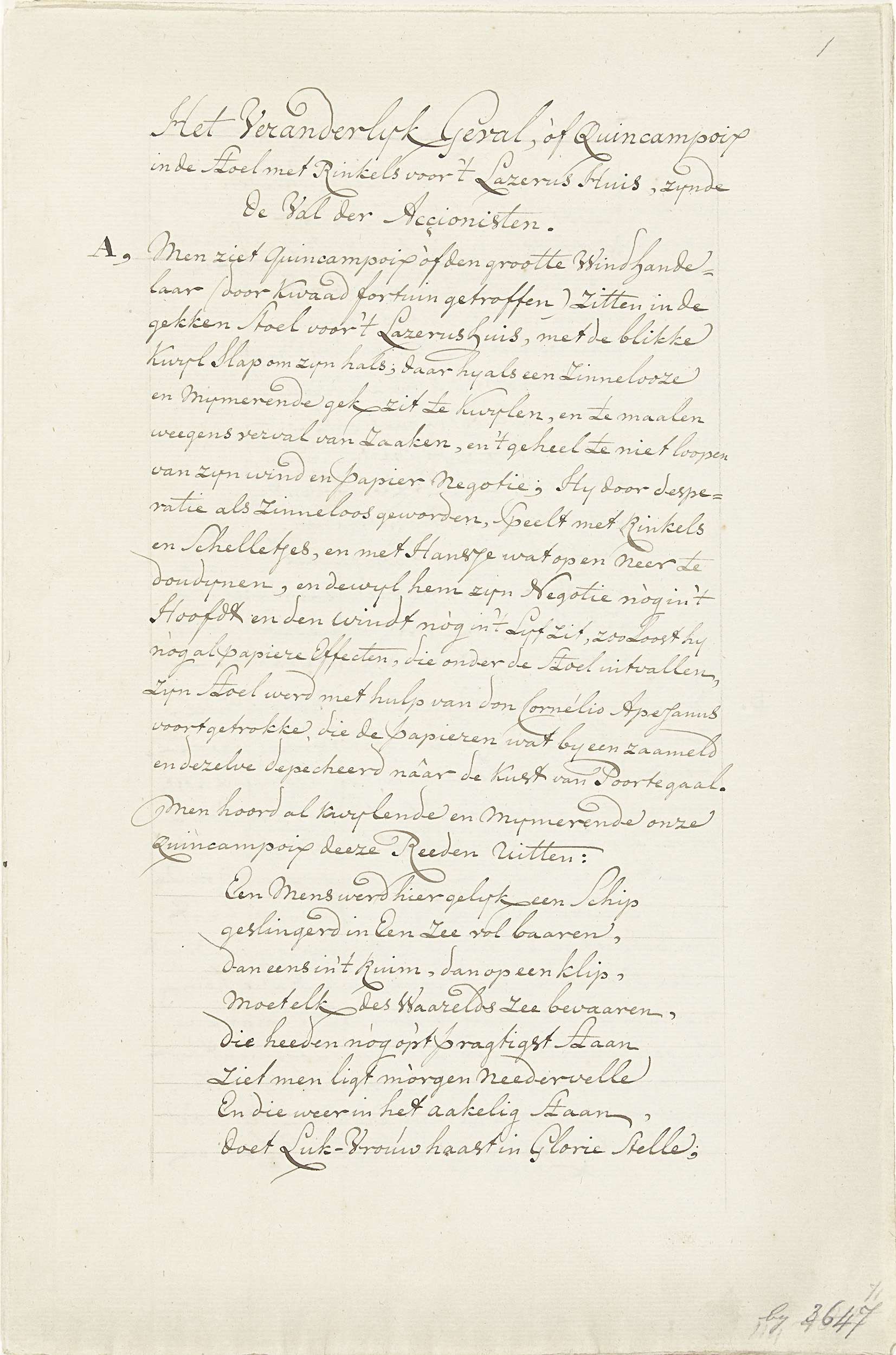 Handgeschreven verklaring van de voorstelling van de tekening Quincampoix in de Stoel mer Rinkels voor 't Lazarus Huis. Vijf dubbelgevouwen bladen en één los blad met een verklaring van de letters A-I. Behoort tot de groep van tekeningen toegevoegd aan de serie Tafereel der Dwaasheid met spotprenten op de Windhandel of Actiehandel van 1720.