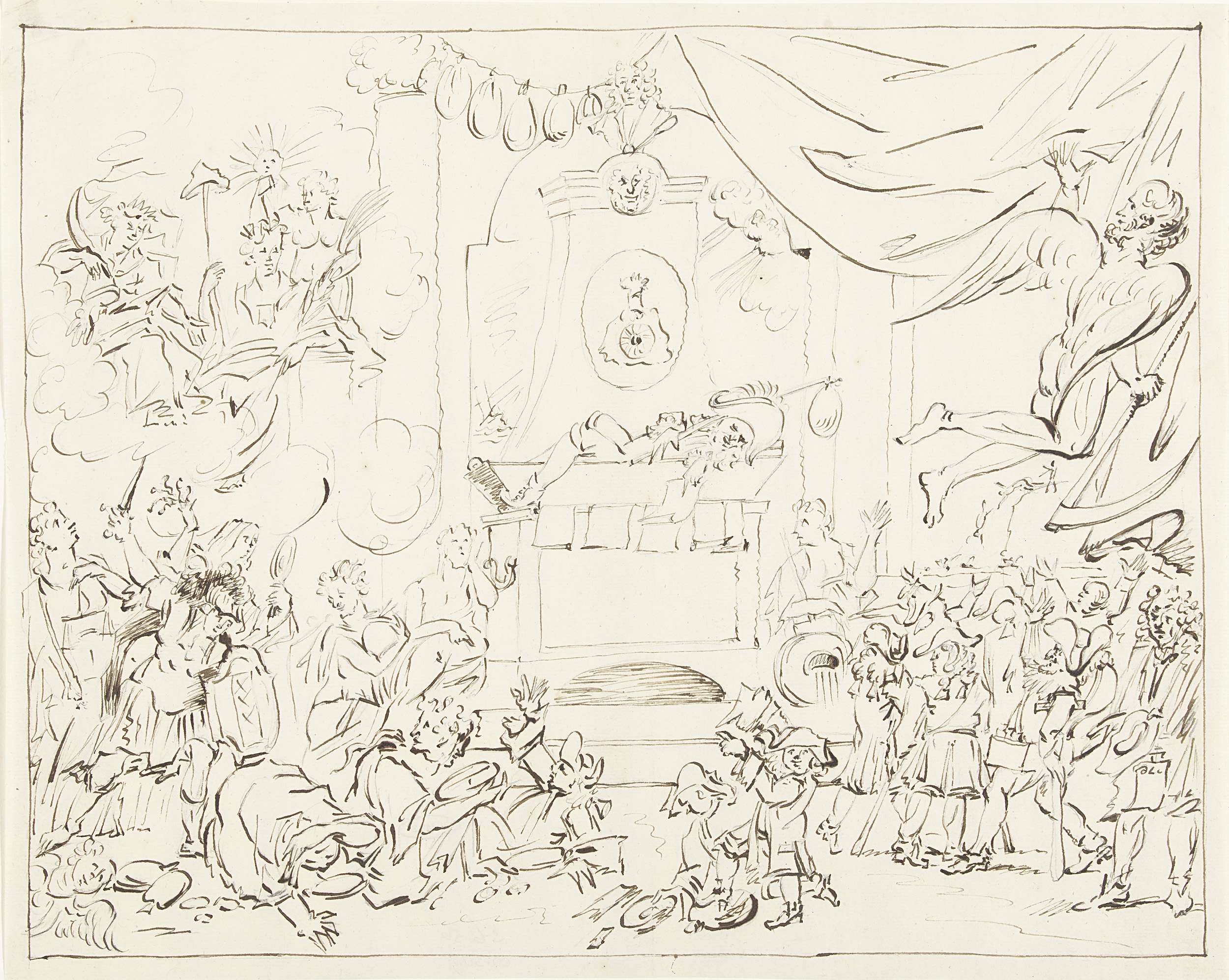Het graf van John Law, de uitvinder van de windhandel. De Tijd trekt een gordijn open en onthult een toneel waarop het grafmonument van John Law staat. Op het toneel vele andere figuren, links de stadsmaagd van Amsterdam met Gerechtigheid en Voorzichtigheid, rechts Bombario tussen actionisten. Linksboven in de wolken de Vrijheid, Overvloed en Apollo. ...