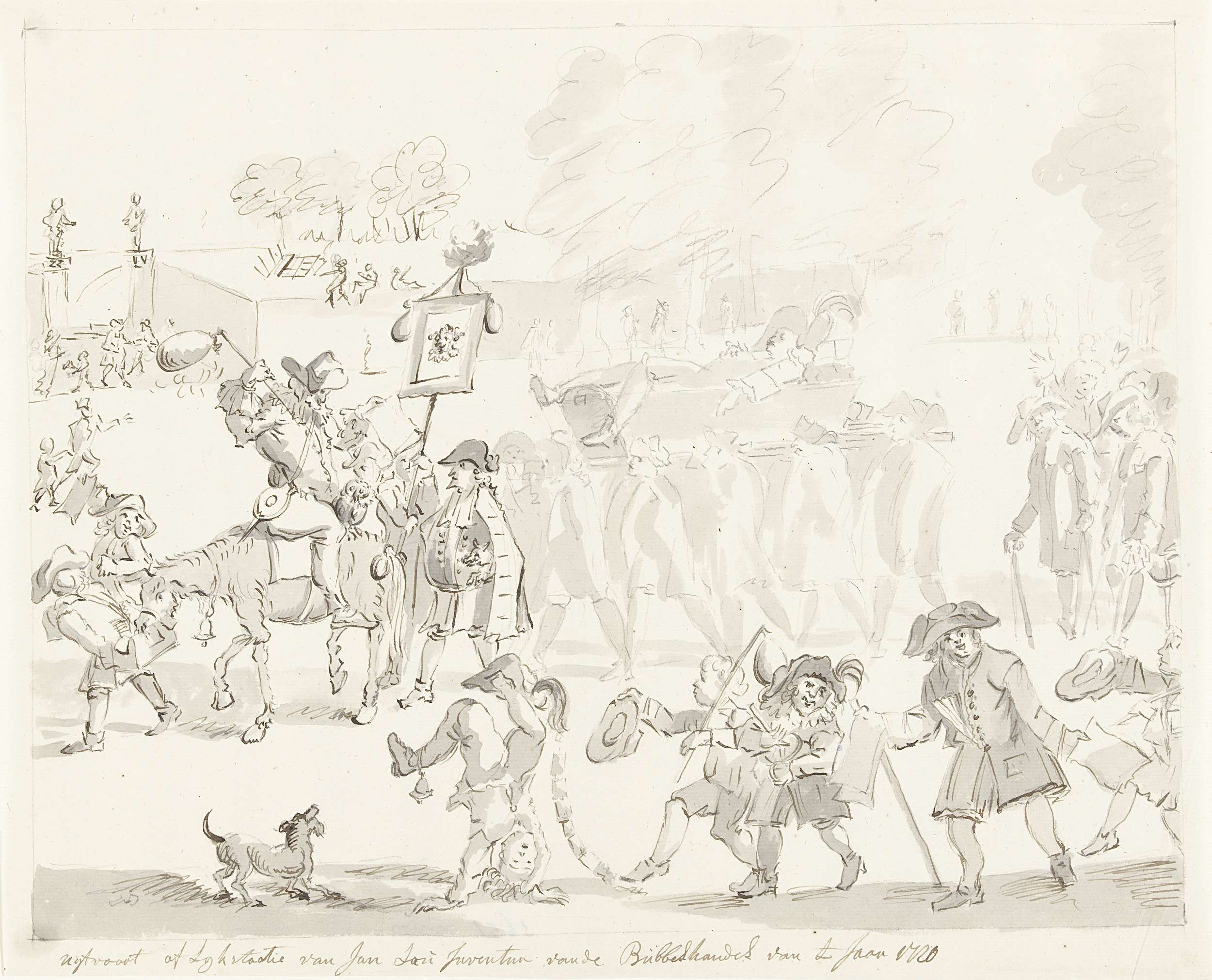 Begrafenisoptocht van John Law, de uitvinder van de windhandel. Stoet voorafgegaan door Bombario achterstevoren op een oud paard. Law ligt op een te kleine kist, op de voorgrond spelende en lachende kinederen. Ontwerptekening voor een niet uitgevoerde prent in een serie over de opkomst en ondergang van Quincampoix (John Law). Behoort tot de groep van ...