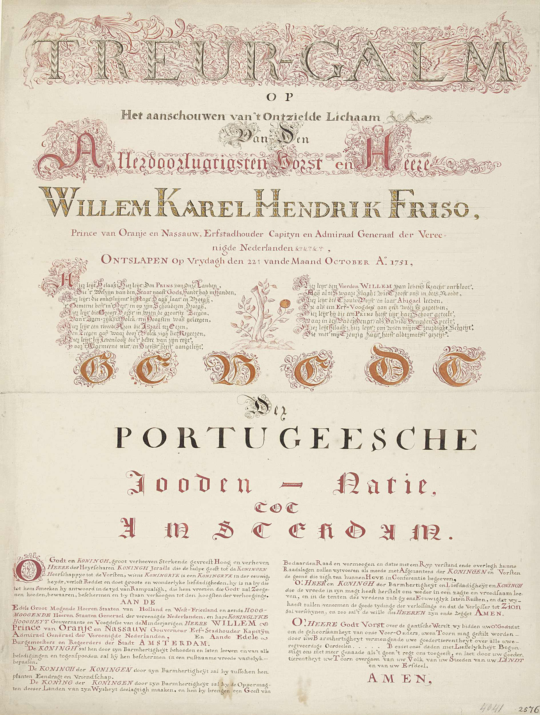 Kalligrafie met een vers op het aanschouwen van het lijk van de op 22 oktober 1751 overleden stadhouder Willem IV en een gebed in naam van de gemeenschap van Portugese joden te Amsterdam. De bovenste regel versierd met twee engelen, een zwaan en enkele andere dieren tussen ranken met bloemen en vruchten. Centraal de afgesneden ...