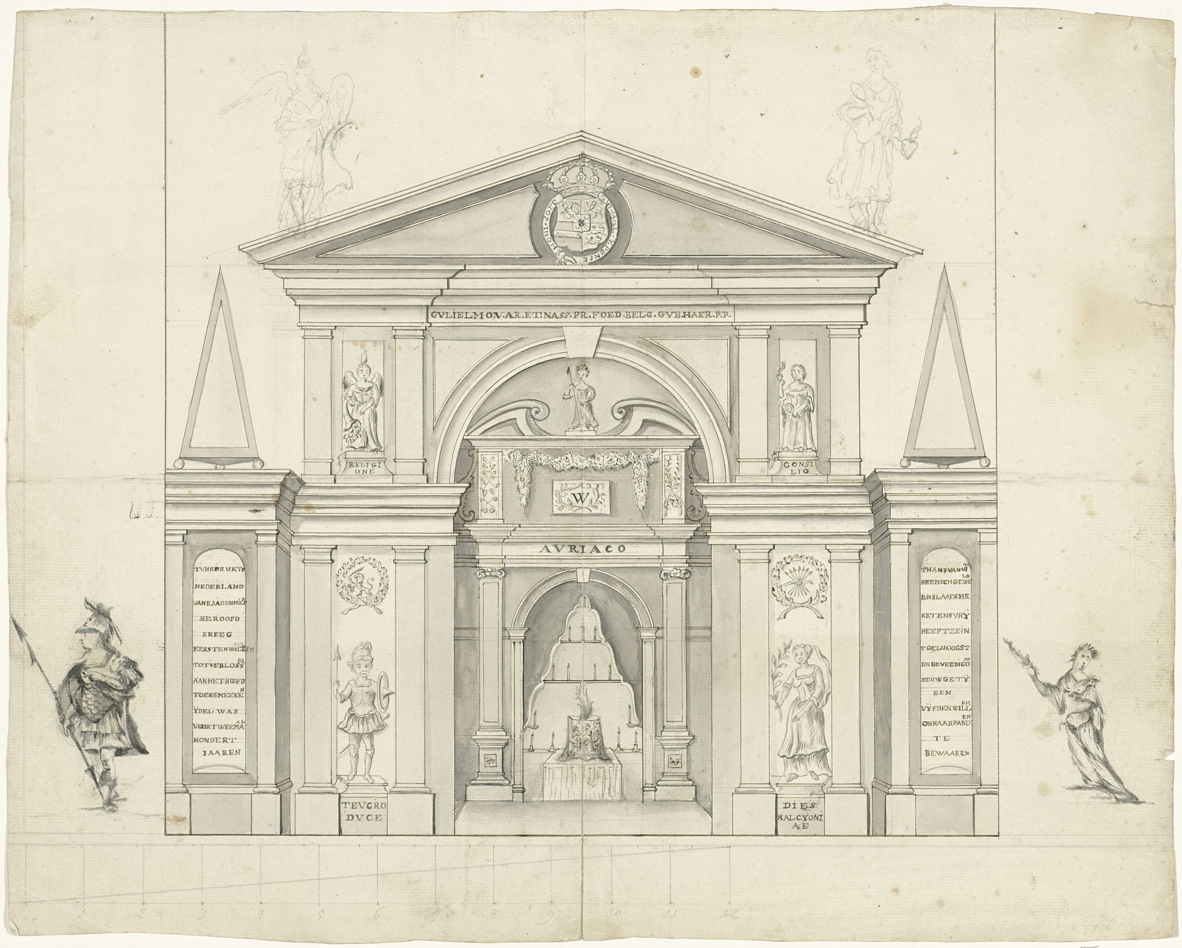 Ontwerp voor een erepoort, waarschijnlijk voor een erepoort te Vlissingen bij de viering van 200 jaar vrijheid in Vlissingen, 6 april 1772. Centraal een altaar met een vlam en het opschrift Auriaco, in de nissen en op het timpaan standbeelden van allegorische figuren. Bovenaan het wapen en de naam van stadhouder Willem V.