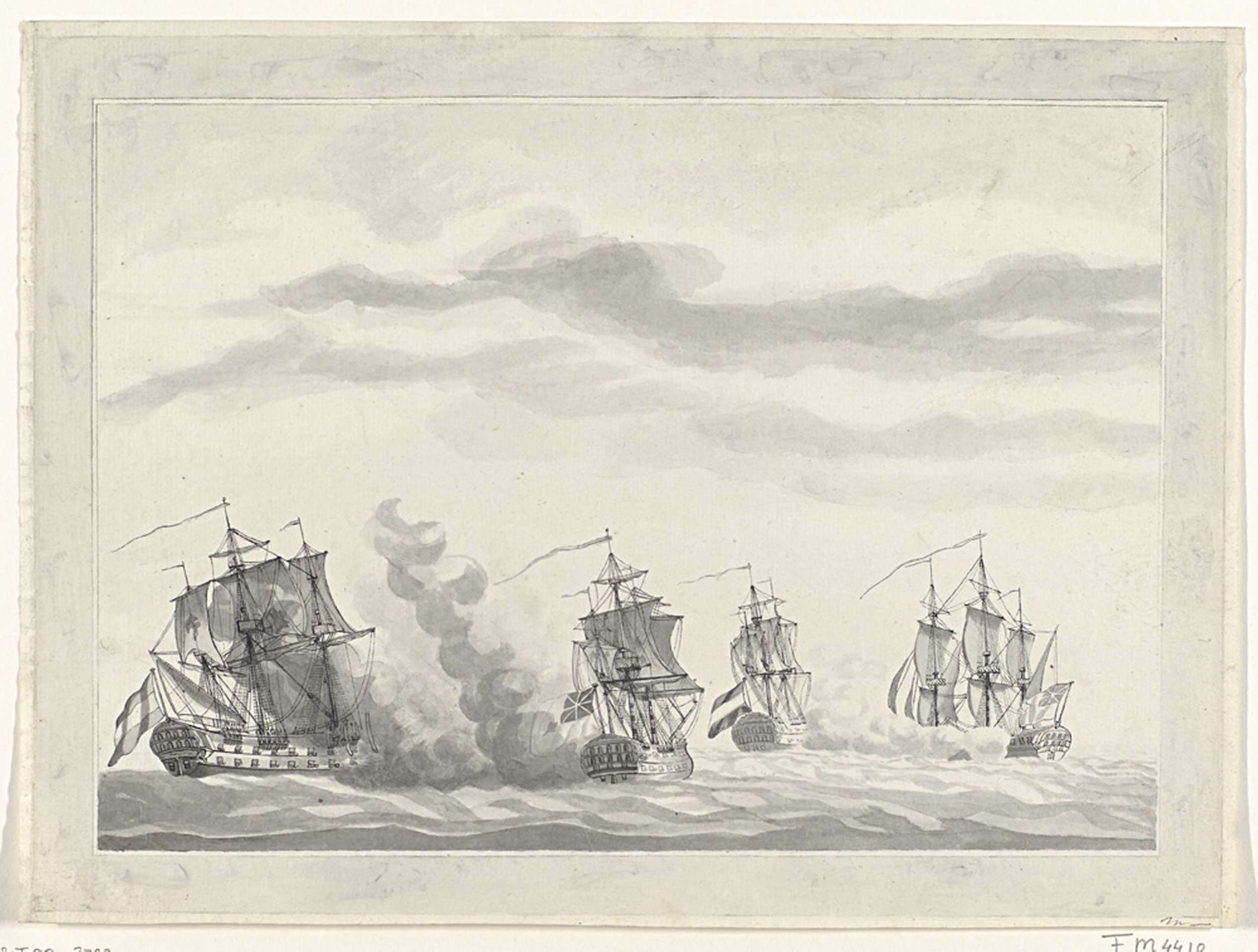 Zeegevecht bij Cadiz tussen twee Nederlandse fregatten Castor en Den Briel en twee Engelse fregatten Flora en Crescent, 30 mei 1781. De vier schepen aan het begin van het gevecht.