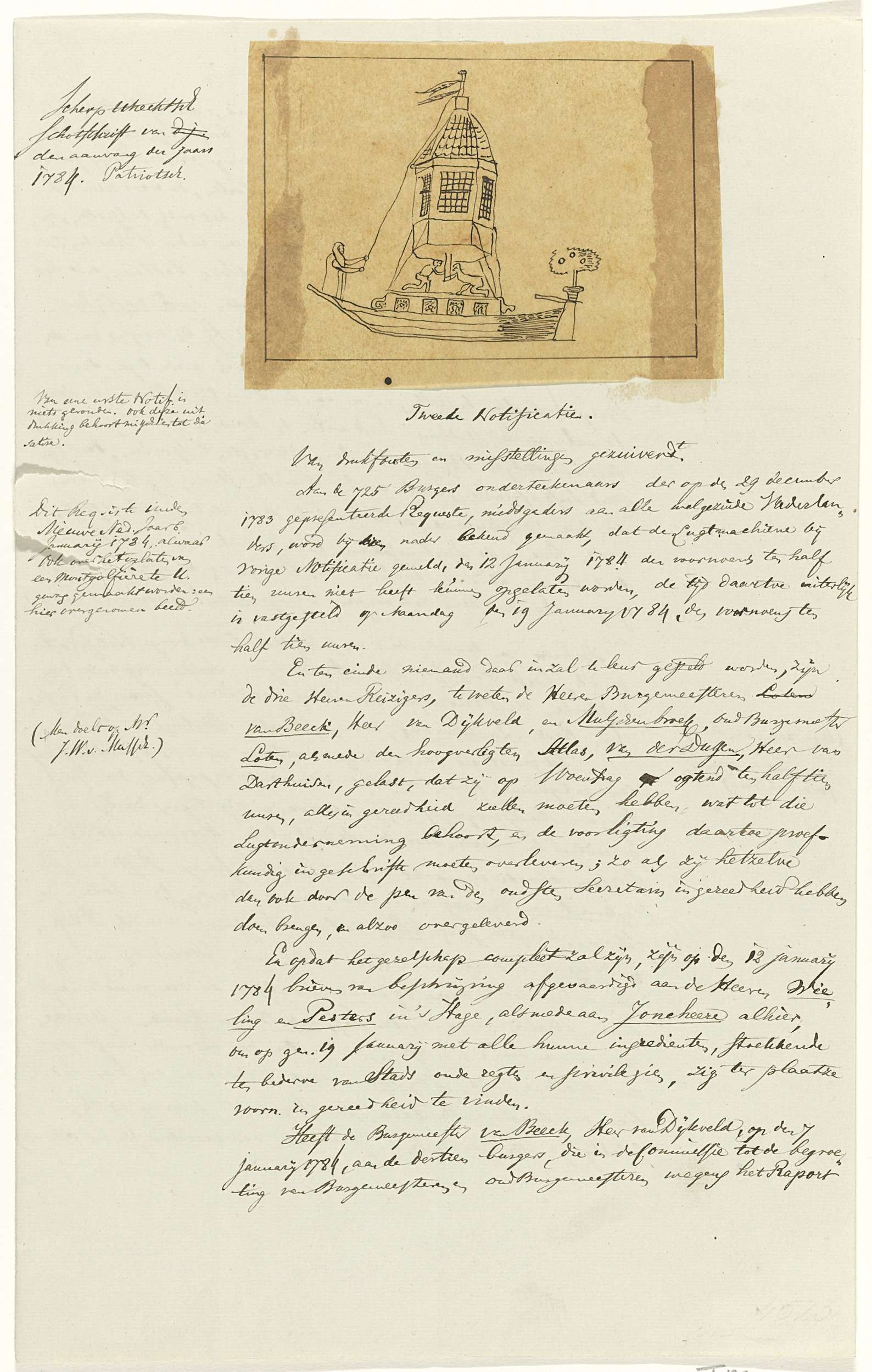 Schets van een luchtballon in de vorm van een huis op een scheepje, het oplaten waarvan oorspronkelijk was gepland voor 29 december 1783 maar verschoven is naar 19 januari 1784. Overtrek van een schets en transcriptie van twee teksten in het bezit van prof. J.F. Hennart te Utrecht. Twee dubbelgevouwen bladen, beide beschreven op drie ...