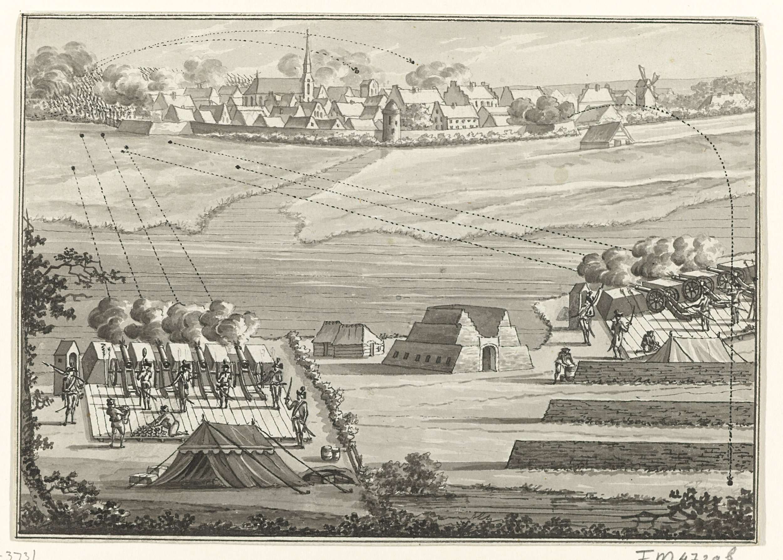 Beschieting van de stad Hattem door de stadhouderlijke troepen, 5 september 1786. Ontwerp voor een prent.