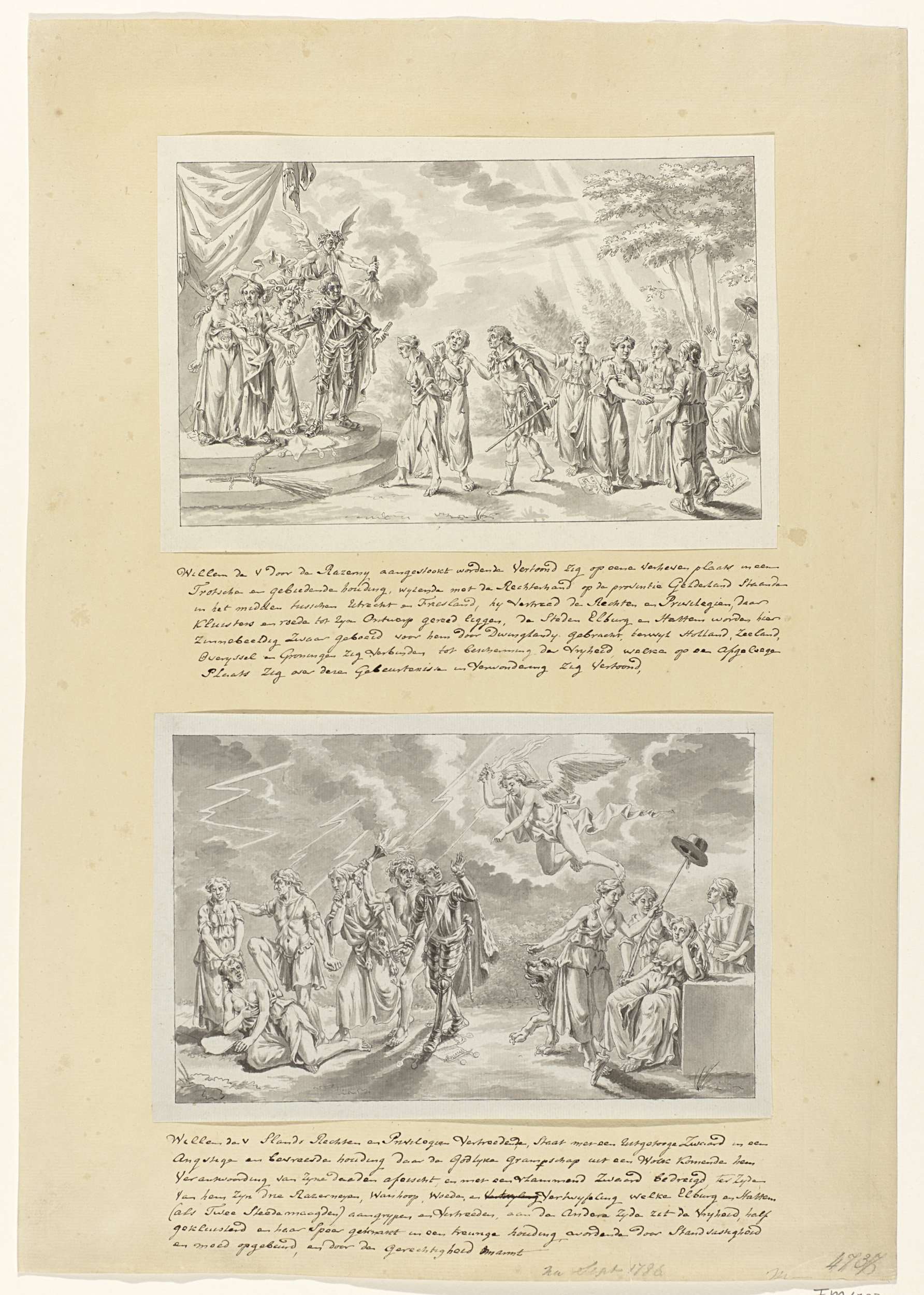 Patriotse allegorie op de aanval op Hattem en Elburg door de stadhouder, 4-6 september 1786. De stadsmaagden van Hattem en Elburg worden door Wanhoop, Woede en Vertwijfeling mishandeld. Prins Willem V vertreedt met getrokken zwaard de rechten en privileges van het land gebracht. Hij raakt echter bevreesd door de Goddelijke Gramschap die hem met vlammend ...