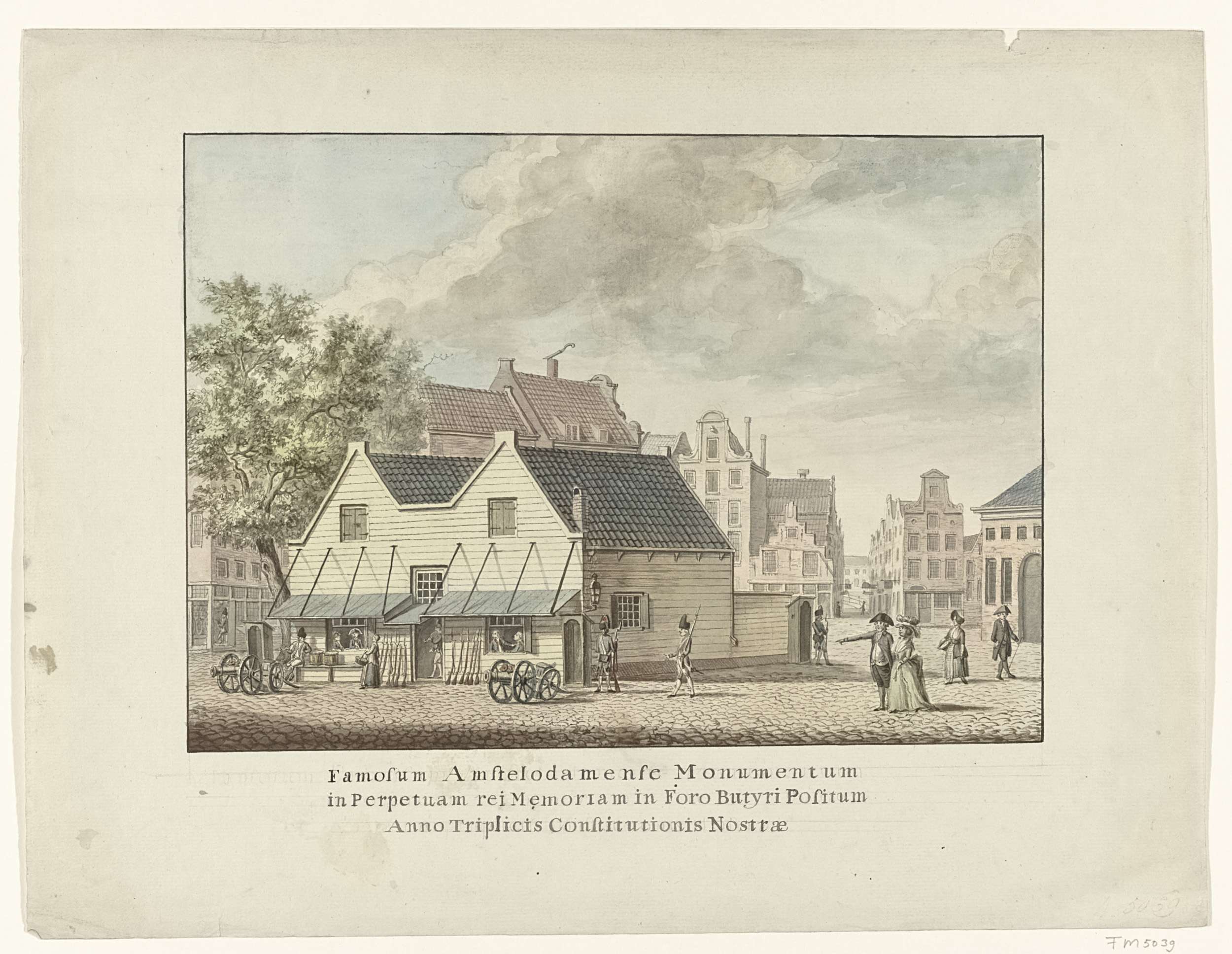 Gezicht op de militaire hoofdwacht van de landsmilitie op de Botermarkt (op het huidige Rembrandtsplein) te Amsterdam, 1787.