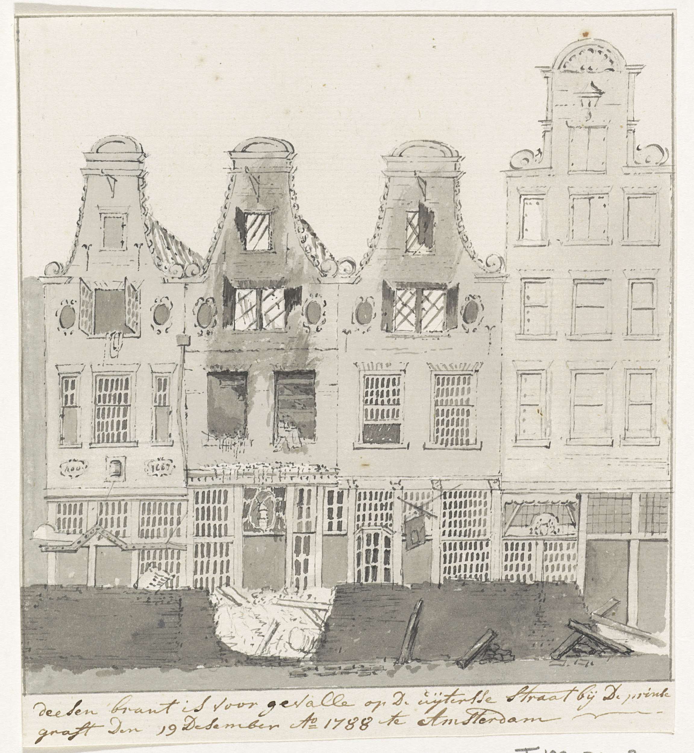 Drie uitgebrande panden aan de Utrechtsestraat (bij de Prinsengracht) te Amsterdam, na de brand op 19 december 1788. Op de verso een tekening van een huis met een trapgevel.