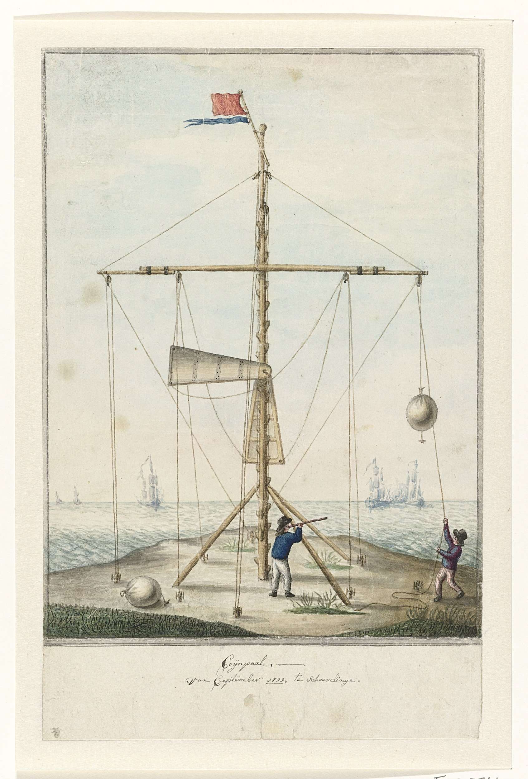 Bataafse kusttelegraaf, semafoor of seinpaal, opgesteld aan de kust bij Scheveningen, september 1799.