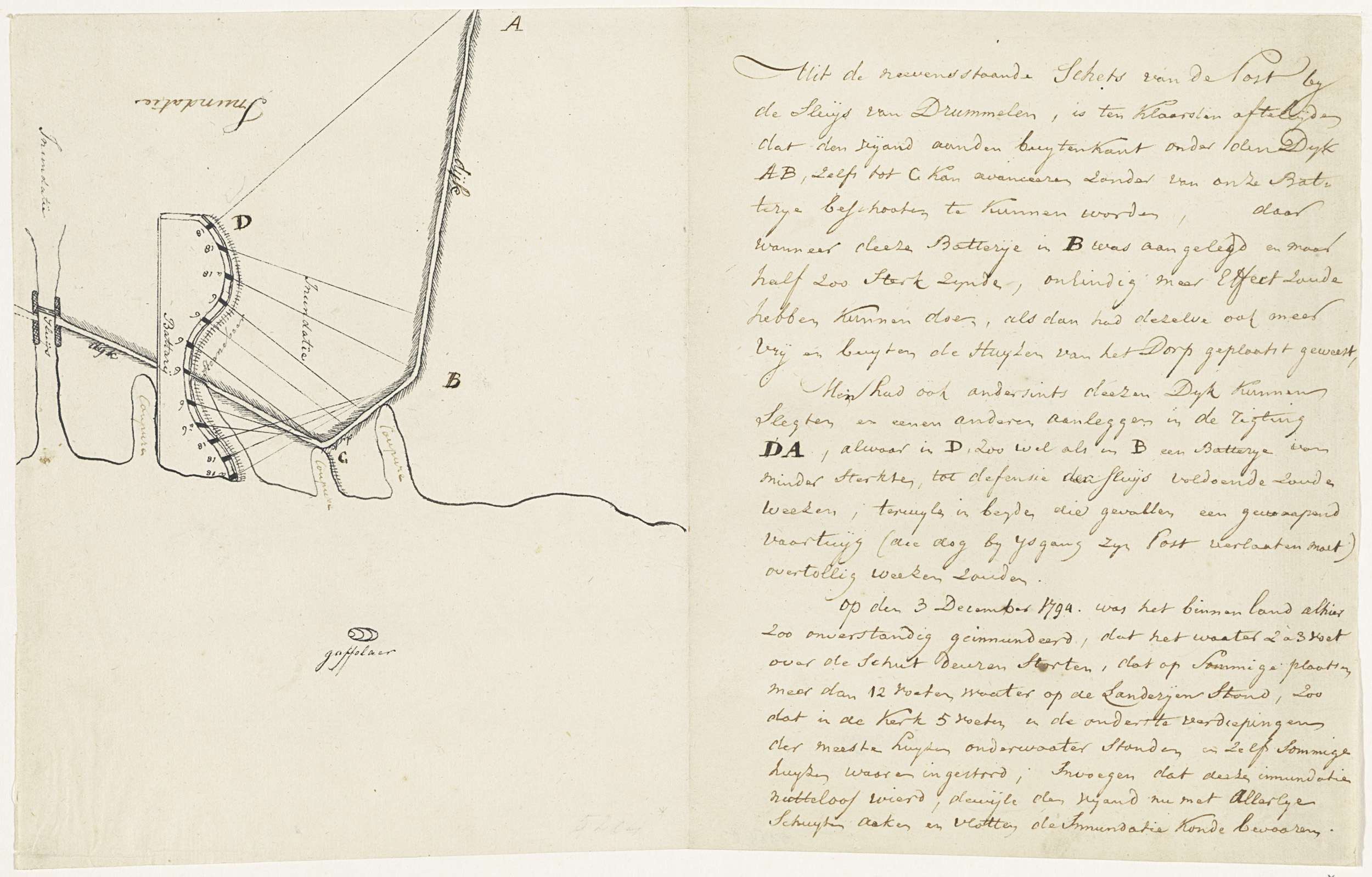 Schets van de inundatie van het land in de omgeving van de sluis van Drimmelen, tegen de oprukkende Franse troepen, op 3 december 1794. Links een schets van een plattegrond met de sluis en de dijk met de batterij, rechts handschrift met een beschrijving van de situatie.