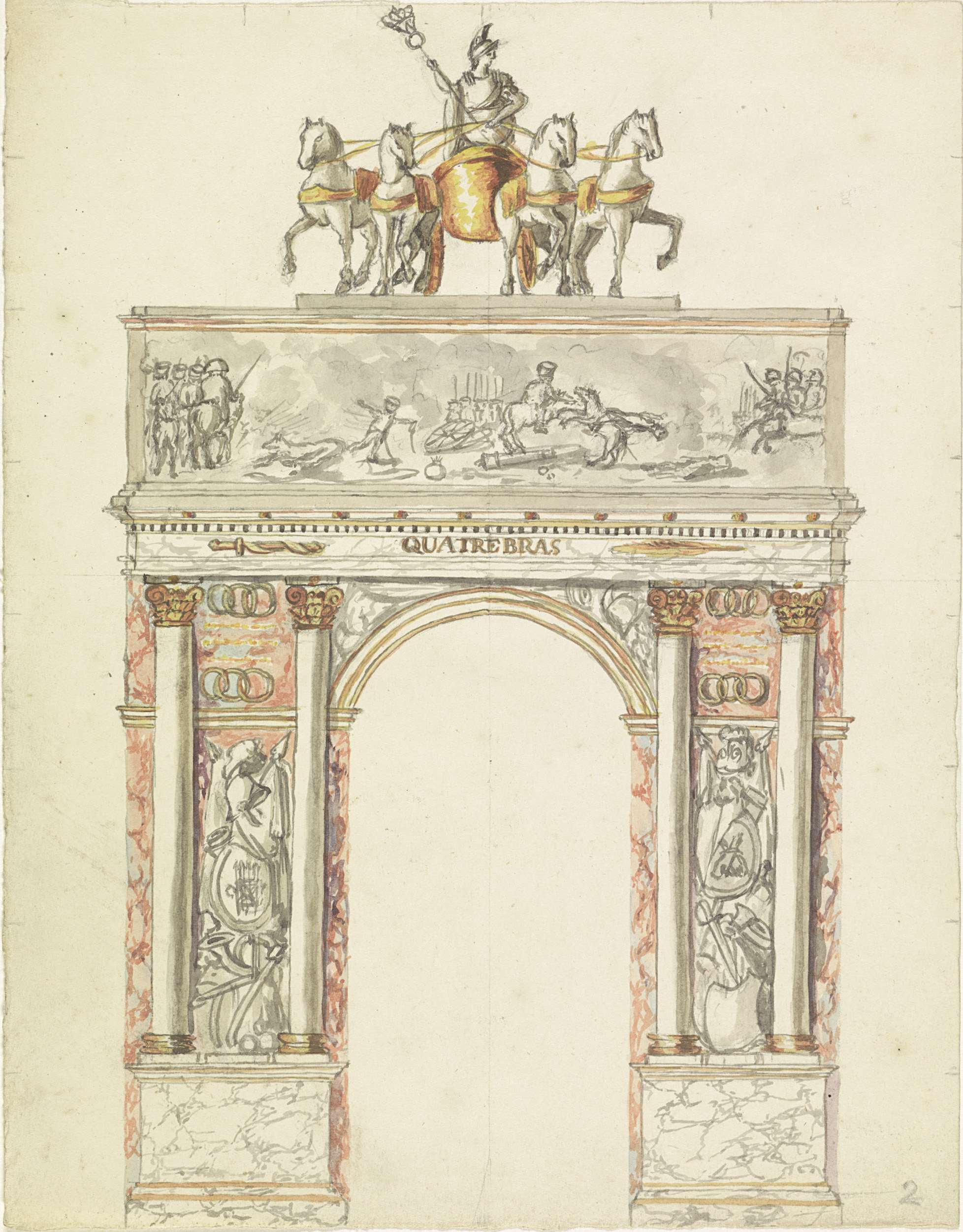 Erepoort met een voorstelling van de prins in de slag bij Quatre-Bras, met bovenop een romeinse triomfwagen. In de lijst wordt het onderwerp van deze poort aangeduid als de slag bij Waterloo. Opgericht bij de Eenhoornsluis. Onderdeel van een serie van 14 (van de 16) tekeningen voor de decoraties opgesteld bij het bezoek van de ...