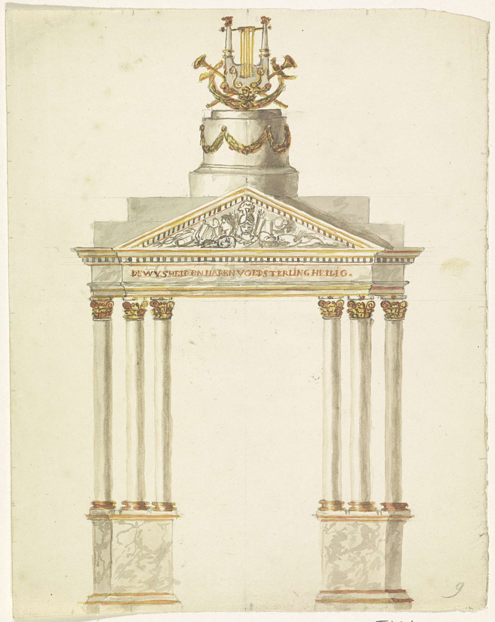 Ereboog als de tempel van Apollo. Tempeltimpaan op zes zuilen, bovenop bekroond met een lier. Opgericht op de Herengracht bij de Leidsestraat. Onderdeel van een serie van 14 (van de 16) tekeningen voor de decoraties opgesteld bij het bezoek van de prins en prinses van Oranje aan Amsterdam op 19 september 1816.