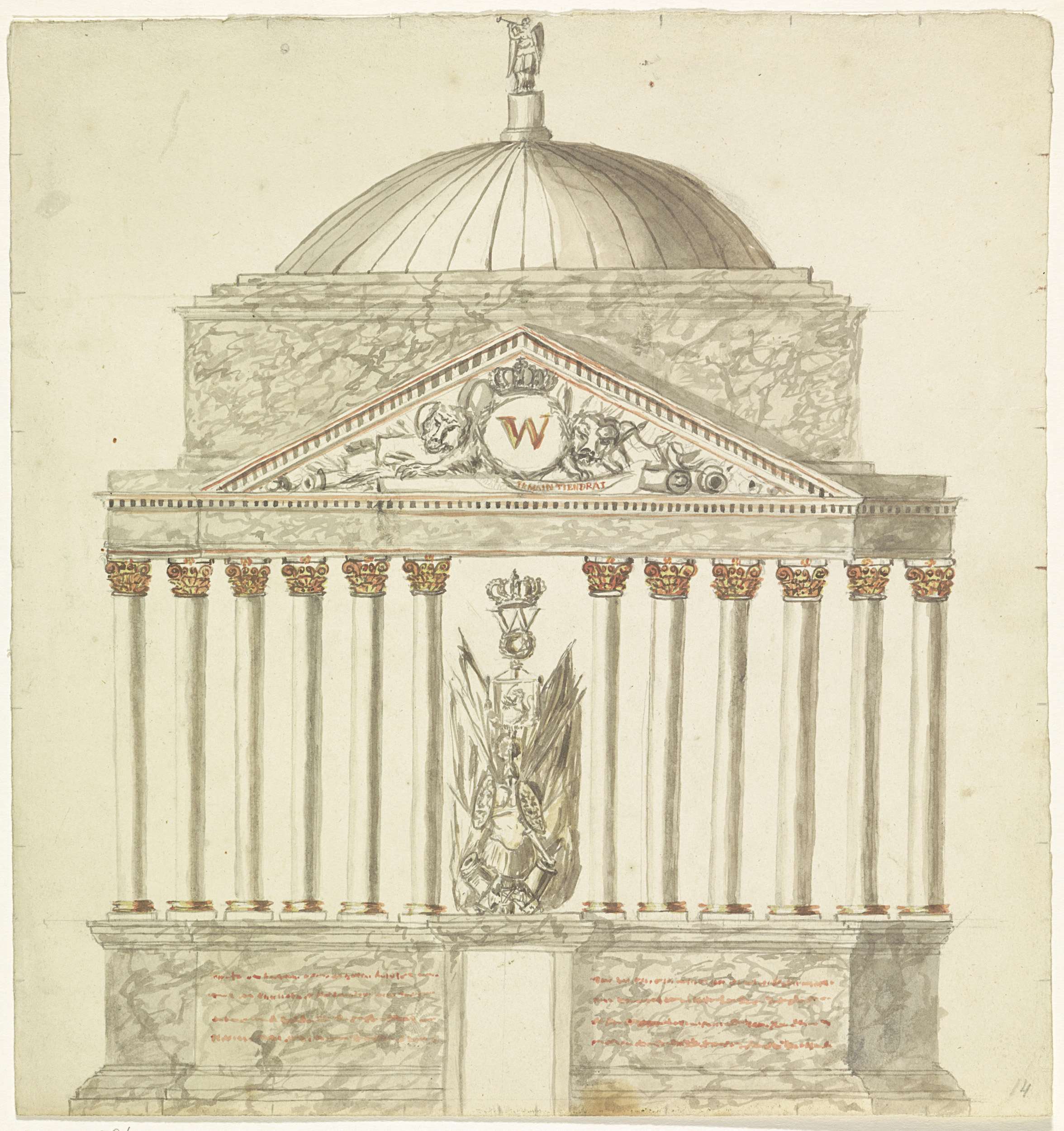 Ereboog in de vorm van een tempel met koepel en twaalf zuilen. Centraal een wapentrofee, in het timpaan de gekroonde W. Opgericht voor het Stadhuis op de Dam. Onderdeel van een serie van 14 (van de 16) tekeningen voor de decoraties opgesteld bij het bezoek van de prins en prinses van Oranje aan Amsterdam op ...