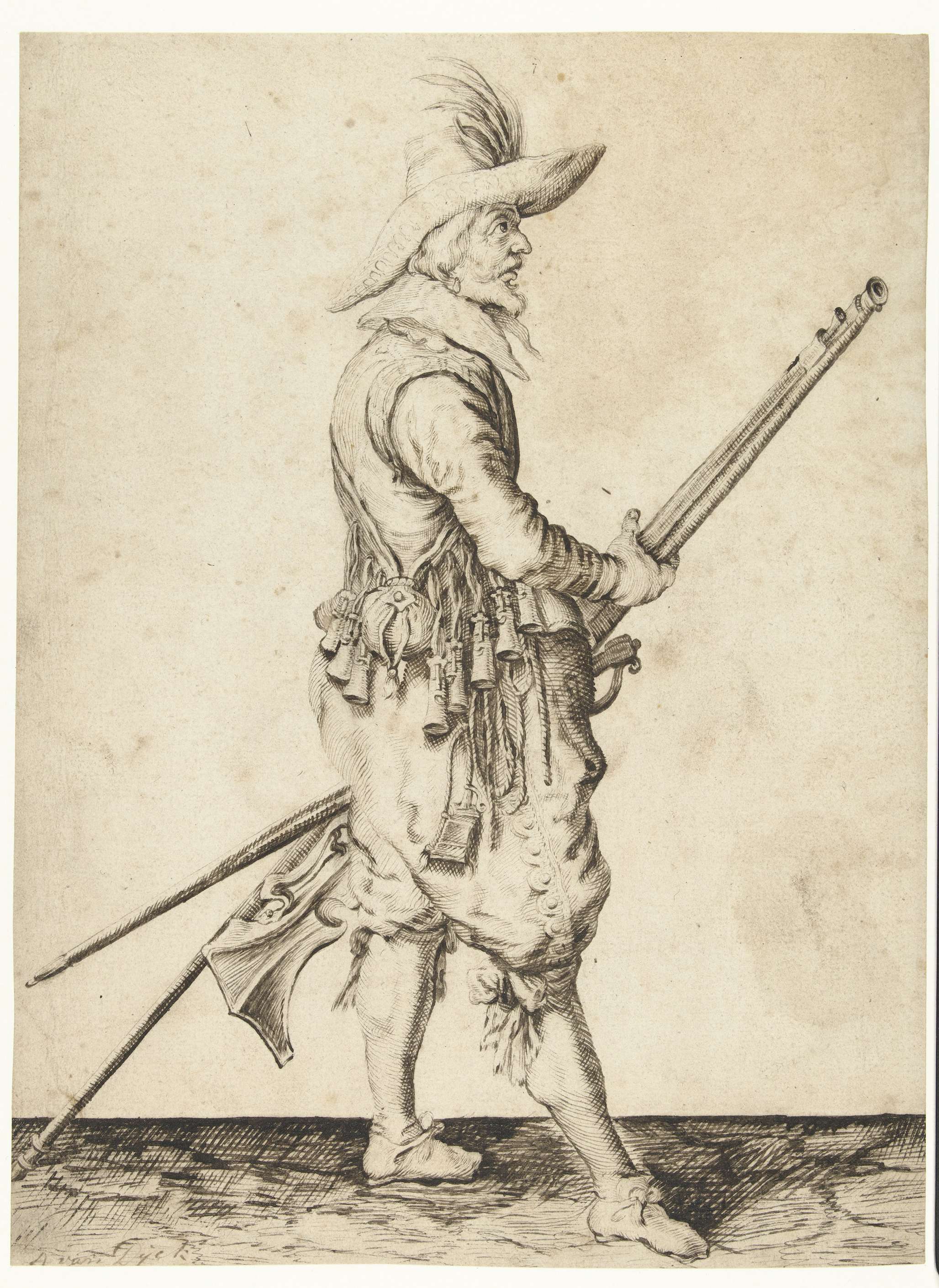 Een soldaat, ten voeten uit, naar rechts, die met beide handen bij zijn linkerdijbeen een musket (een bepaald type vuurwapen) vasthoudt. Kopie naar plaat 22 in de instructies voor het hanteren van het musket in de Wapenhandelinghe van J. de Gheyn (1607). Krijgswezen rond 1600.