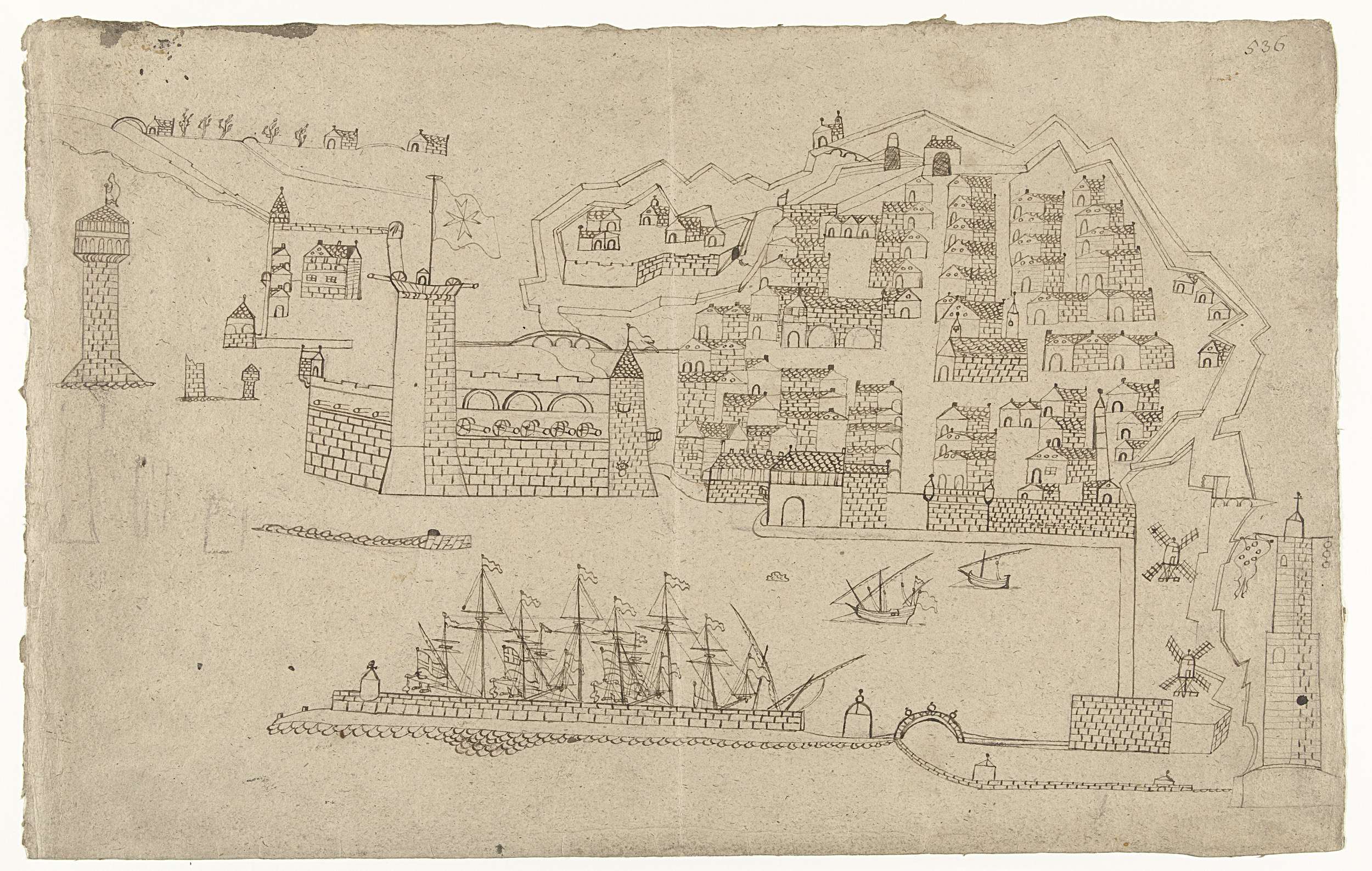 Stad met haven, op de toren midden links een vlag met een Maltezer Kruis. Op verso een schets van een bewapend zeilschip.