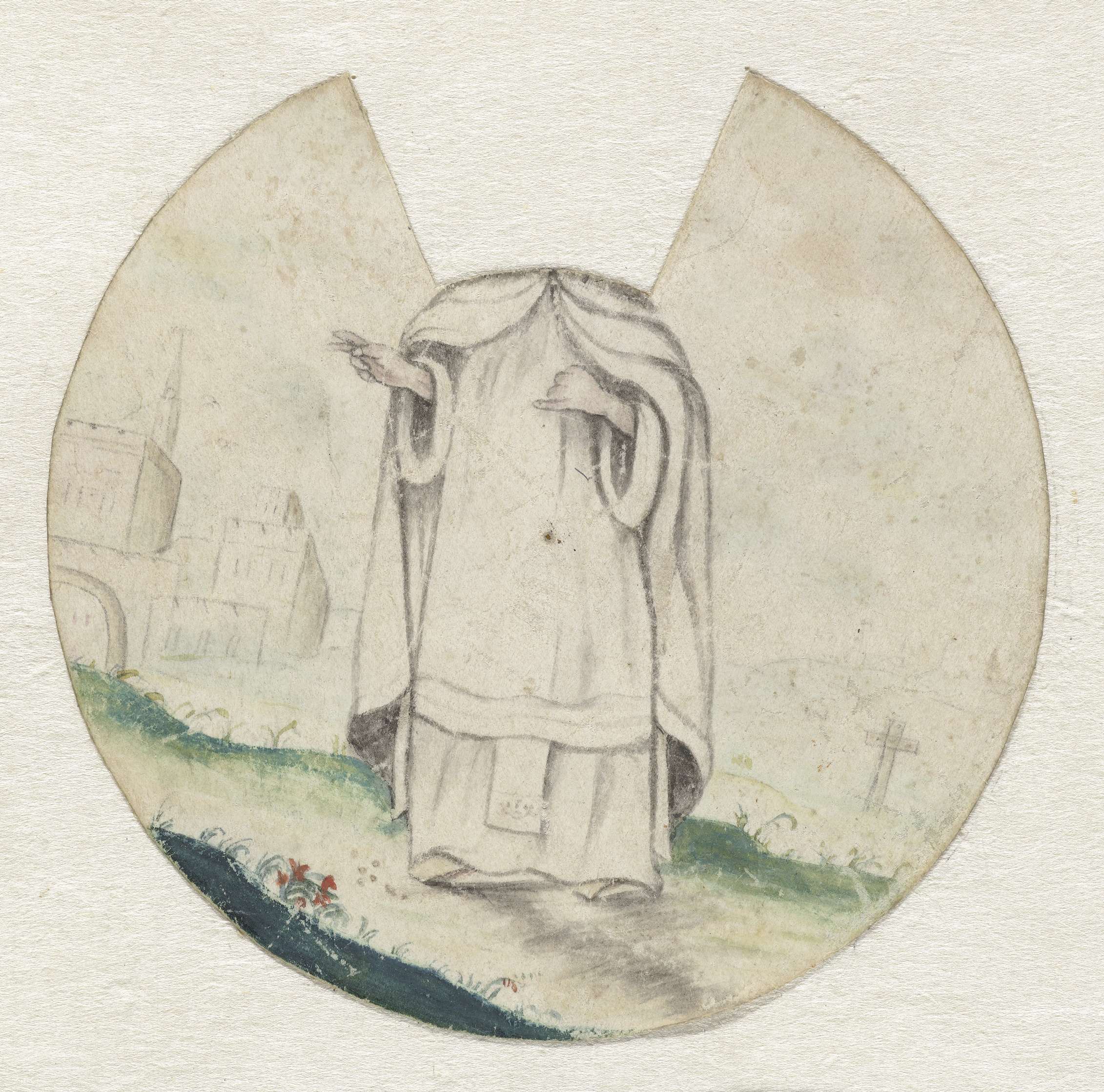 Staande katholieke geestelijke in een witte pij. Hij maakt een zegenend gebaar. Van het ronde blad is een stuk uitgesneden waardoor het hoofd ontbreekt. De tekening is een onderdeel van een combinatie van twee schijven, het andere draaischijf (met verschillende hoofden) ontbreekt. Anti-roomse satire voorstelling.