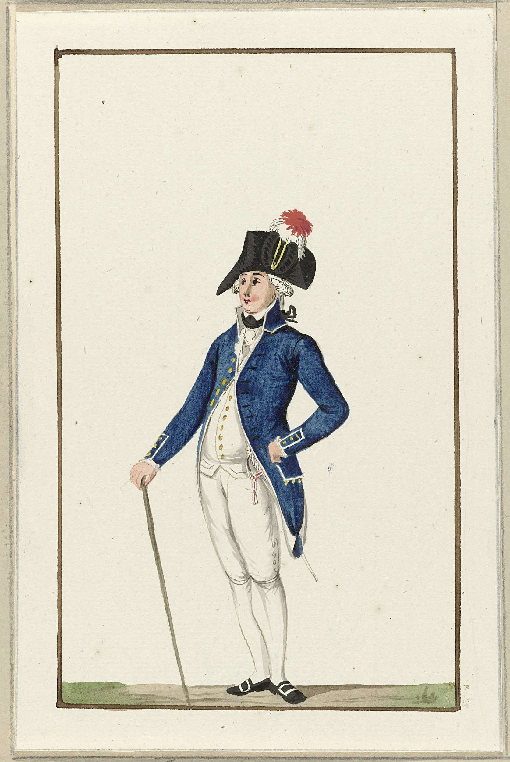 Uniform van het exercitiegenootschap van Gouda. Onderdeel van een serie van 32 tekeningen van de verschillende monteringen (uniformen) van patriotse schutterijen en burgerkorpsen in Nederland in 1787.