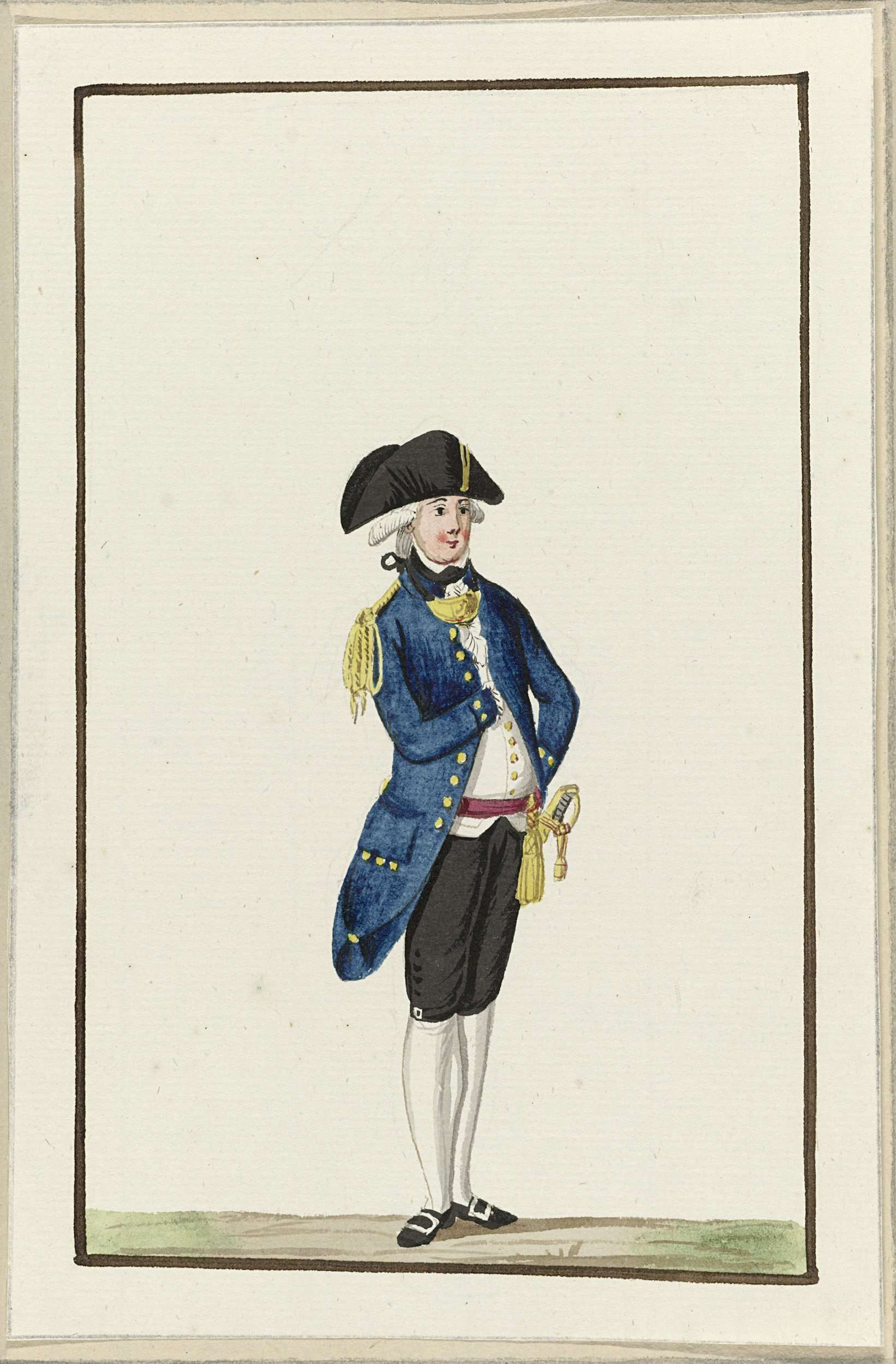 Uniform van de schutterij van 's-Gravenhage. Onderdeel van een serie van 32 tekeningen van de verschillende monteringen (uniformen) van patriotse schutterijen en burgerkorpsen in Nederland in 1787.