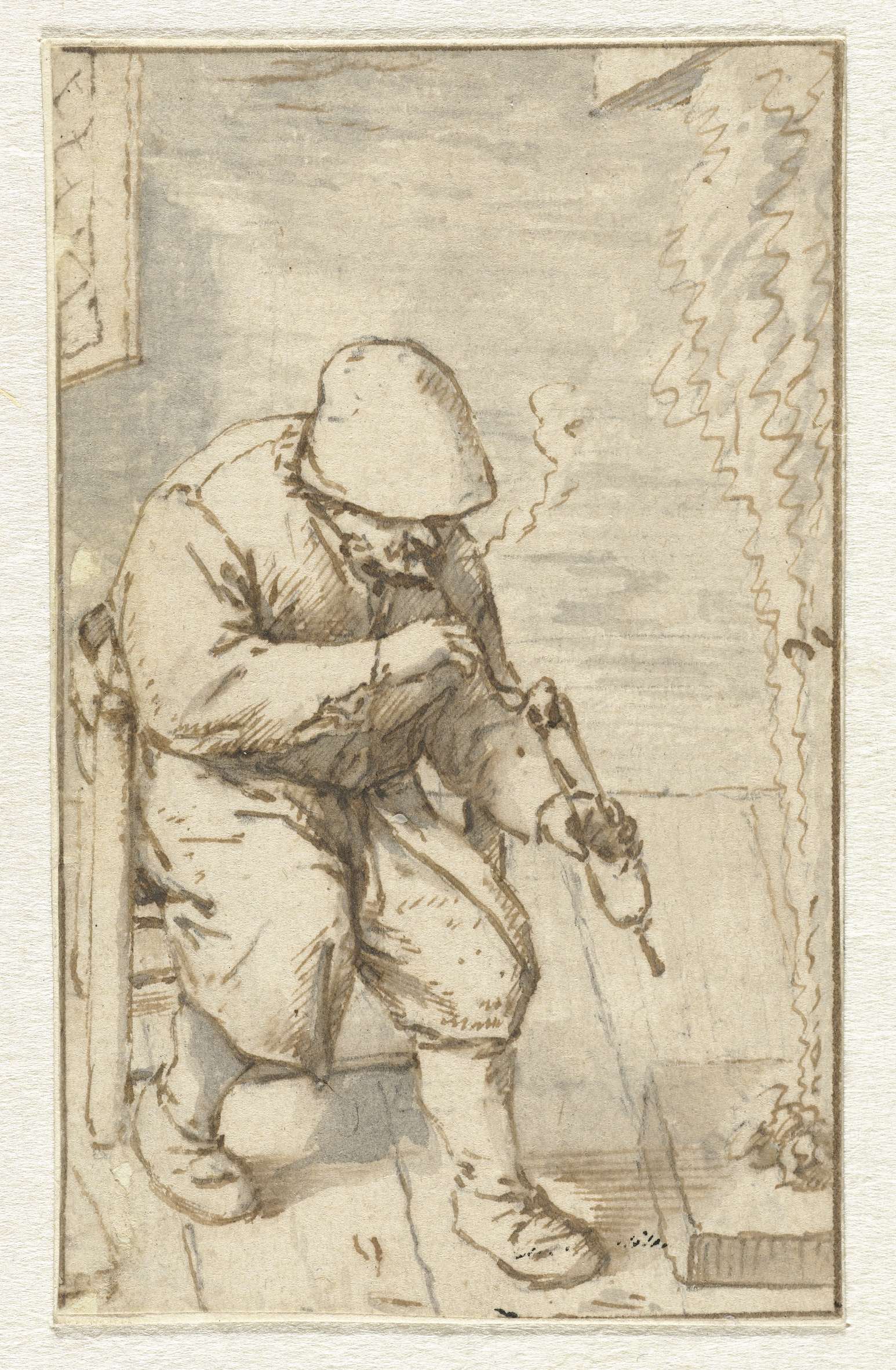 Een boer, bij het vuur gezeten, steekt met een vuurtang zijn pijp aan.