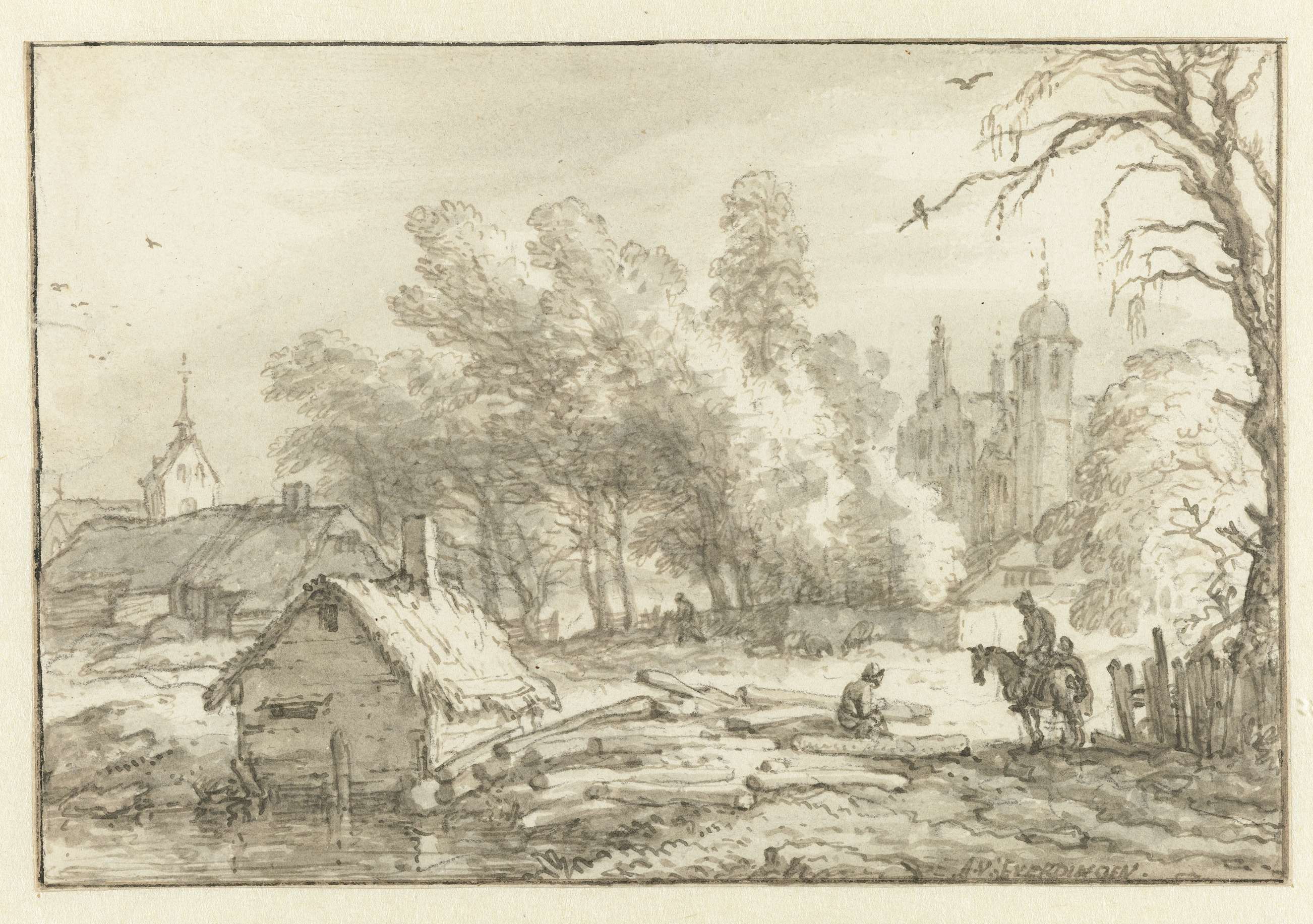 Dorpsgezicht, vooraan spreekt een ruiter met een man die op een stapel balken zit.