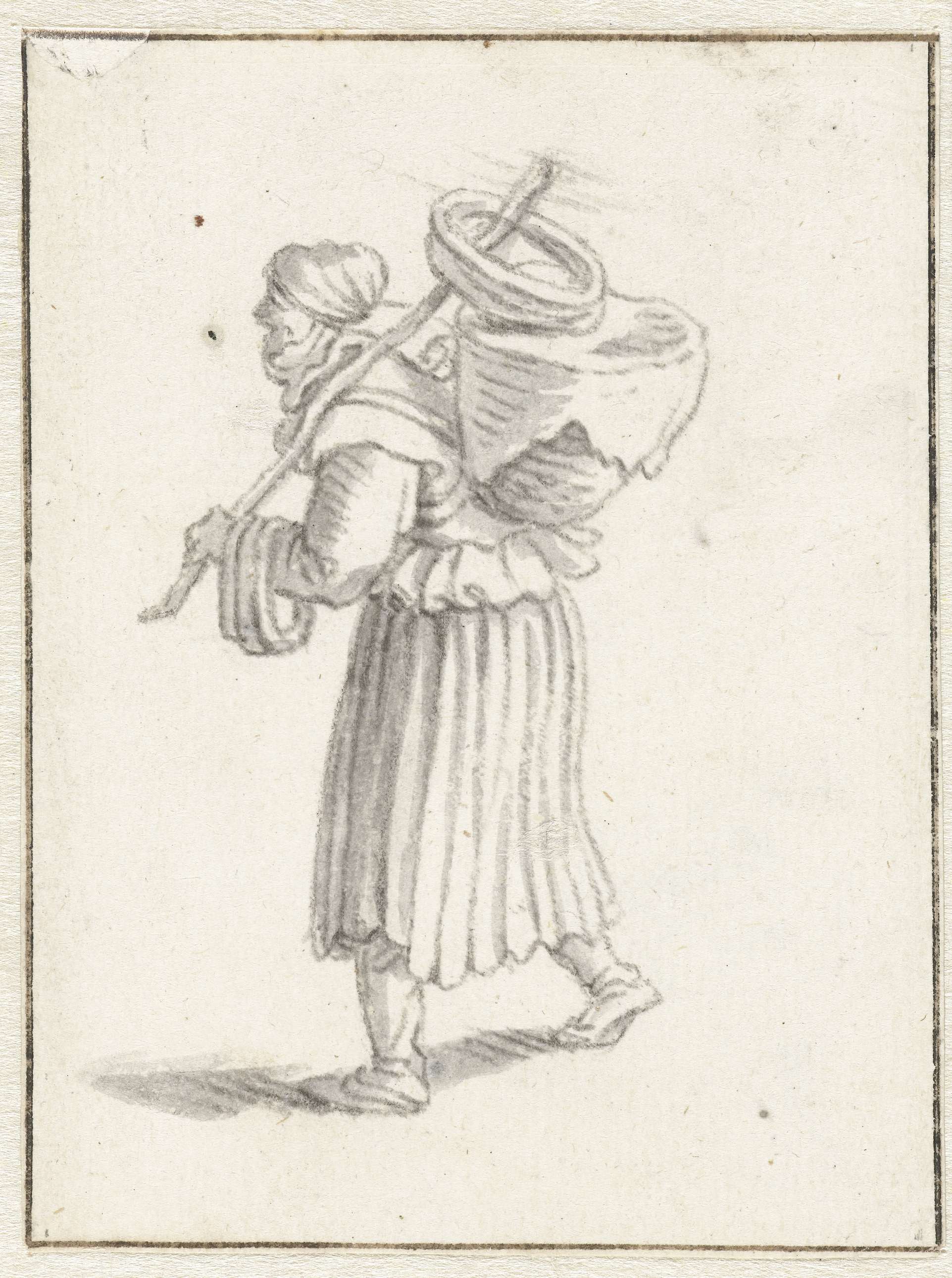 Vrouw met een mand op haar rug, lopend naar links.