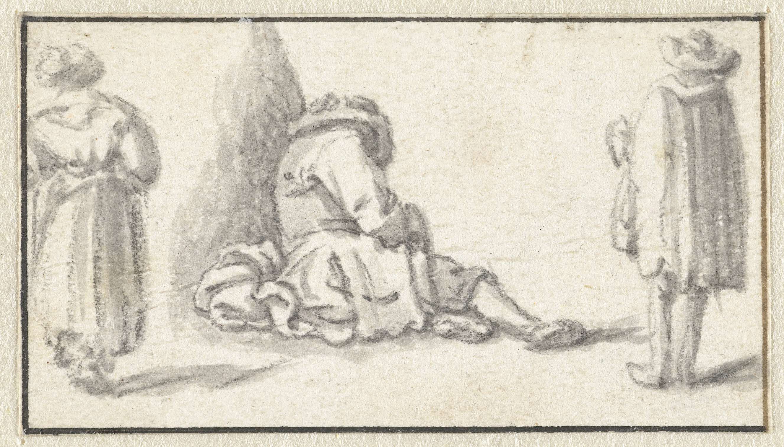 Slapende man, een staande vrouw en een staande man