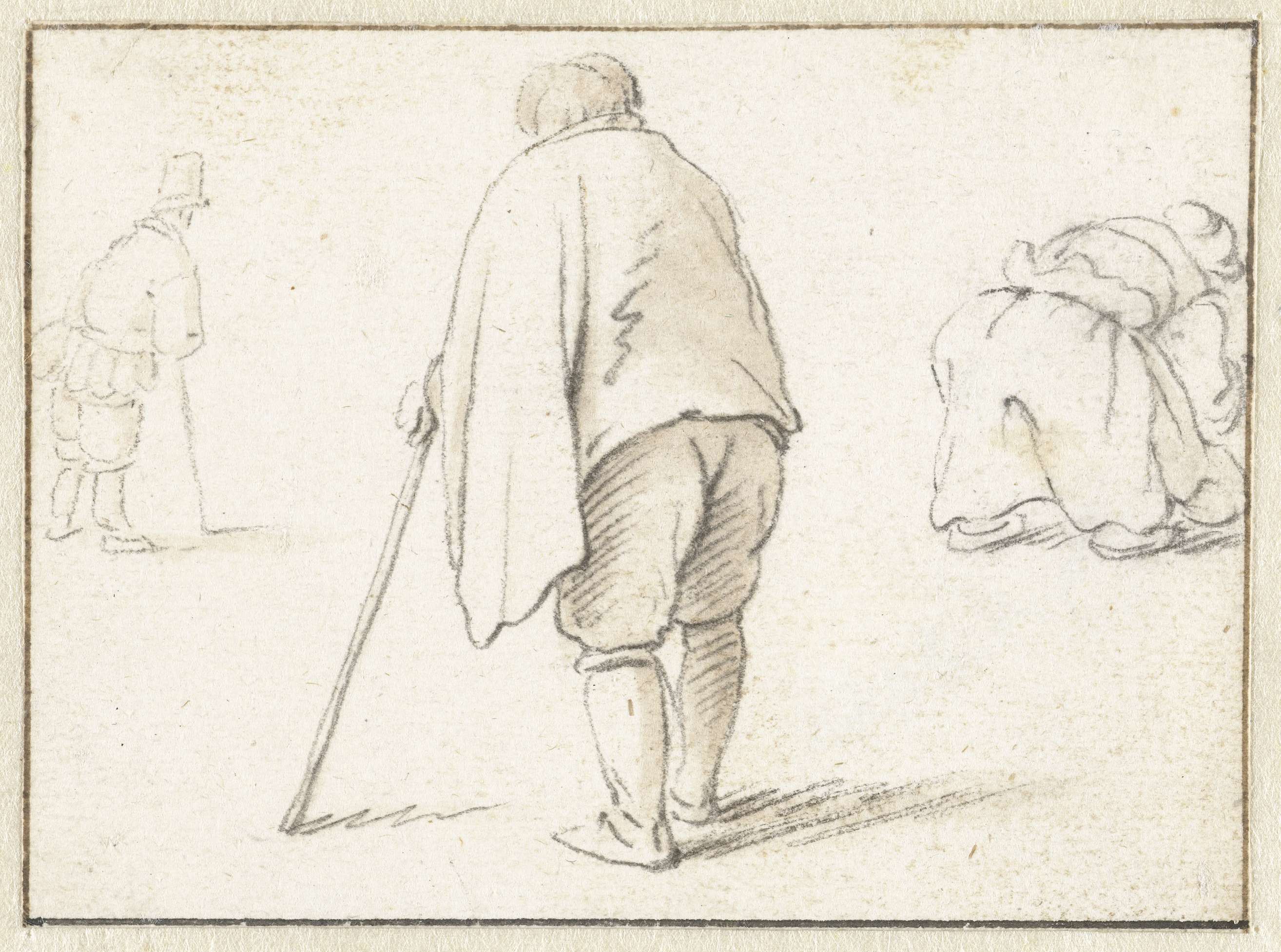 Een staande man met een stok, op de achtergrond een staande man en een bukkende vrouw.