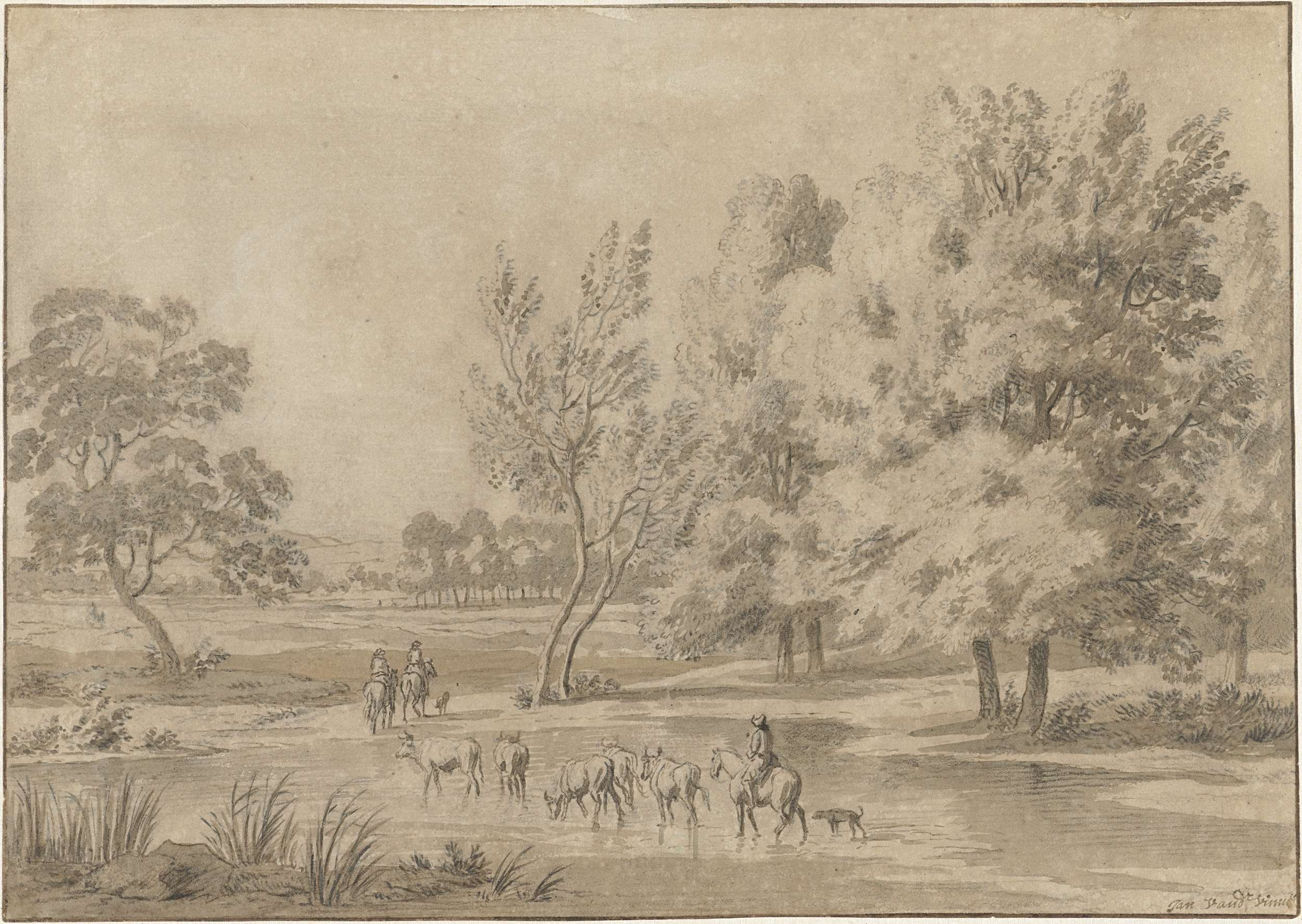 Landschap met bomen, ruiters en enkele koeien in een drenkplaats
