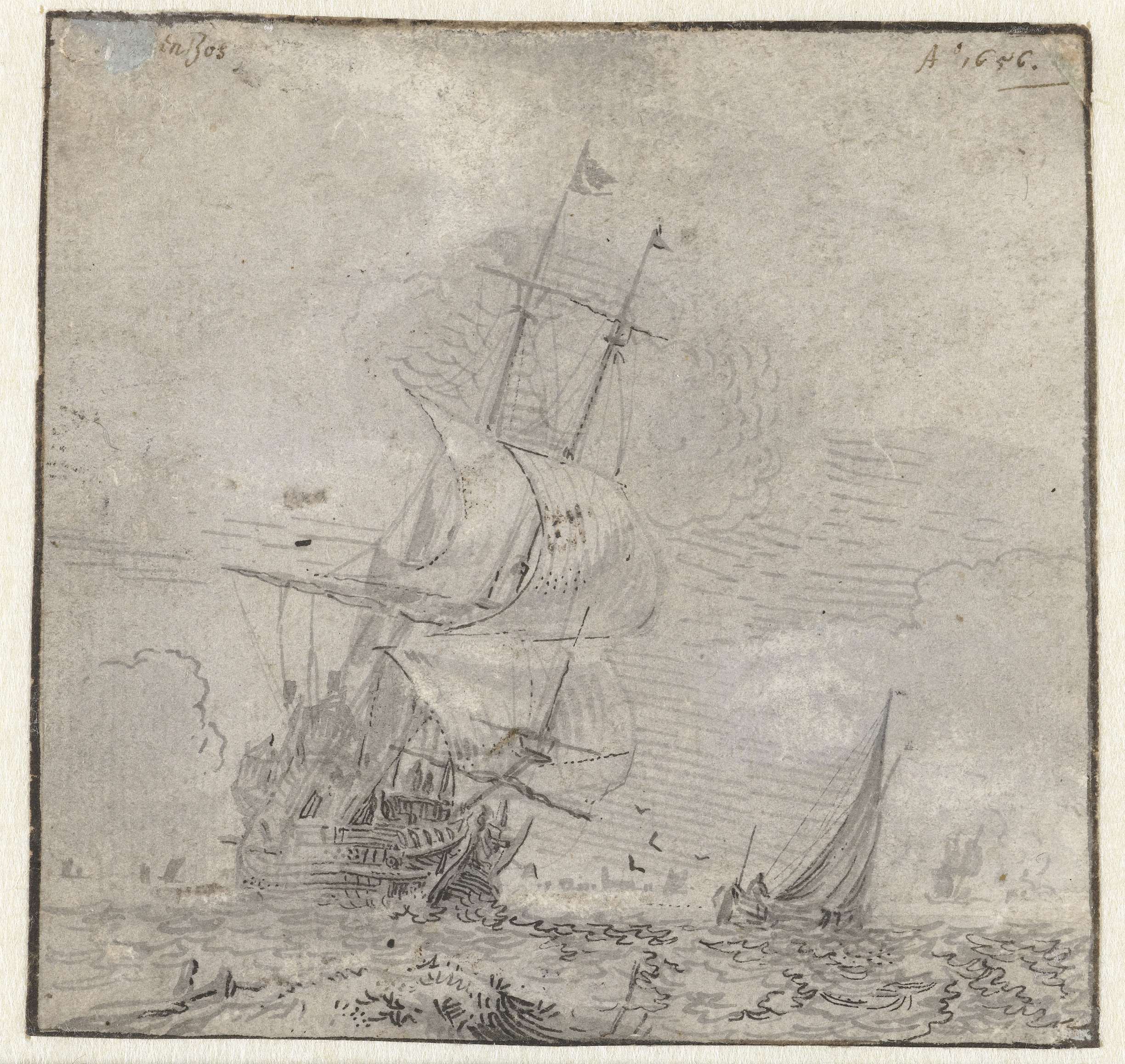 Een driemaster met volle zeilen; op de voorgrond is een kuststrook te zien en in de verte het profiel van een stad.