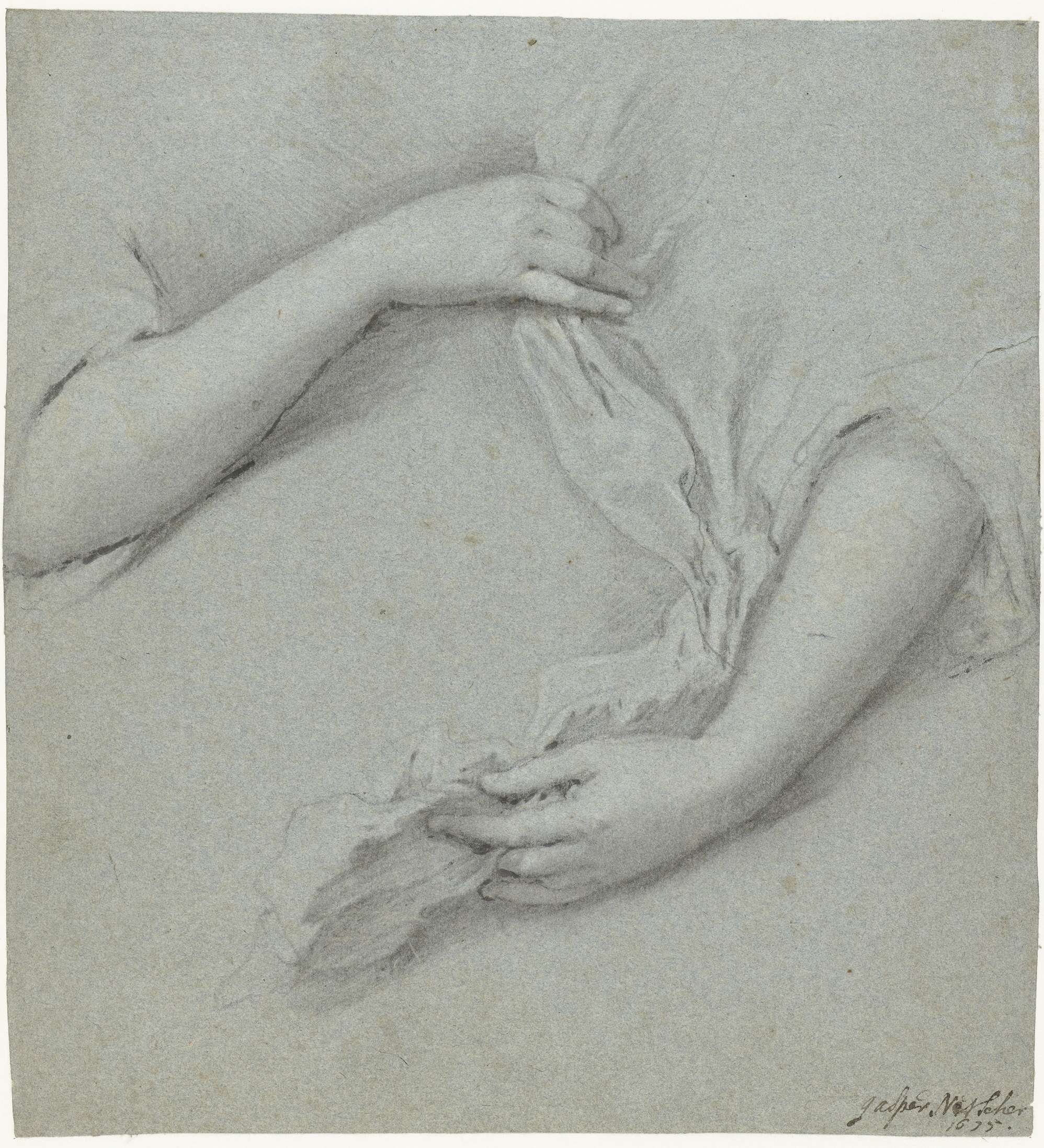 Studieblad: linkerarm met hand van een vrouw, een draperie vasthoudend en rechterarm en hand van een vrouw, een draperie vasthoudend.