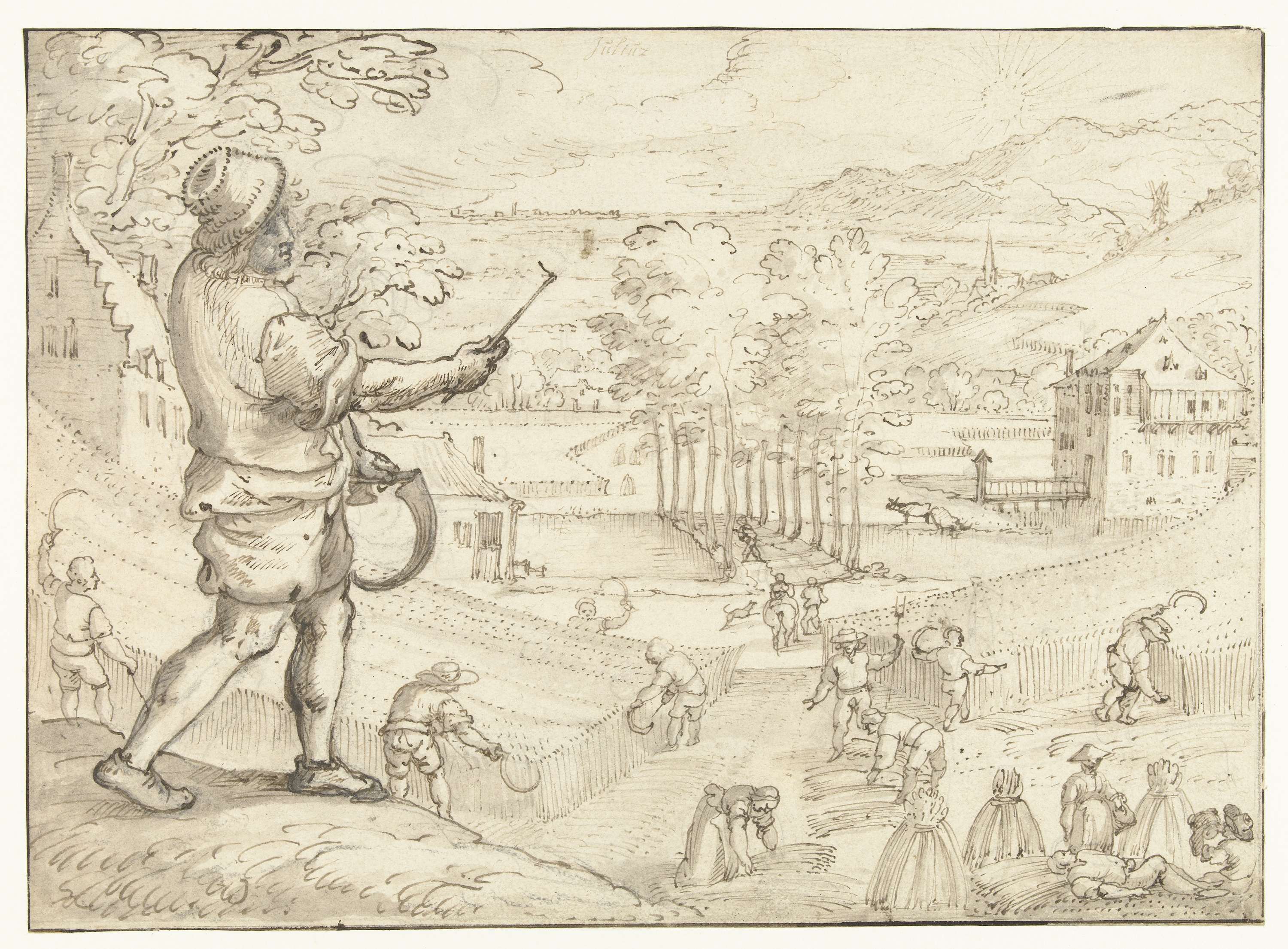 De maand juli. Man met sikkel, rechts het oogsten van vlas. Ontwerp voor een prent.