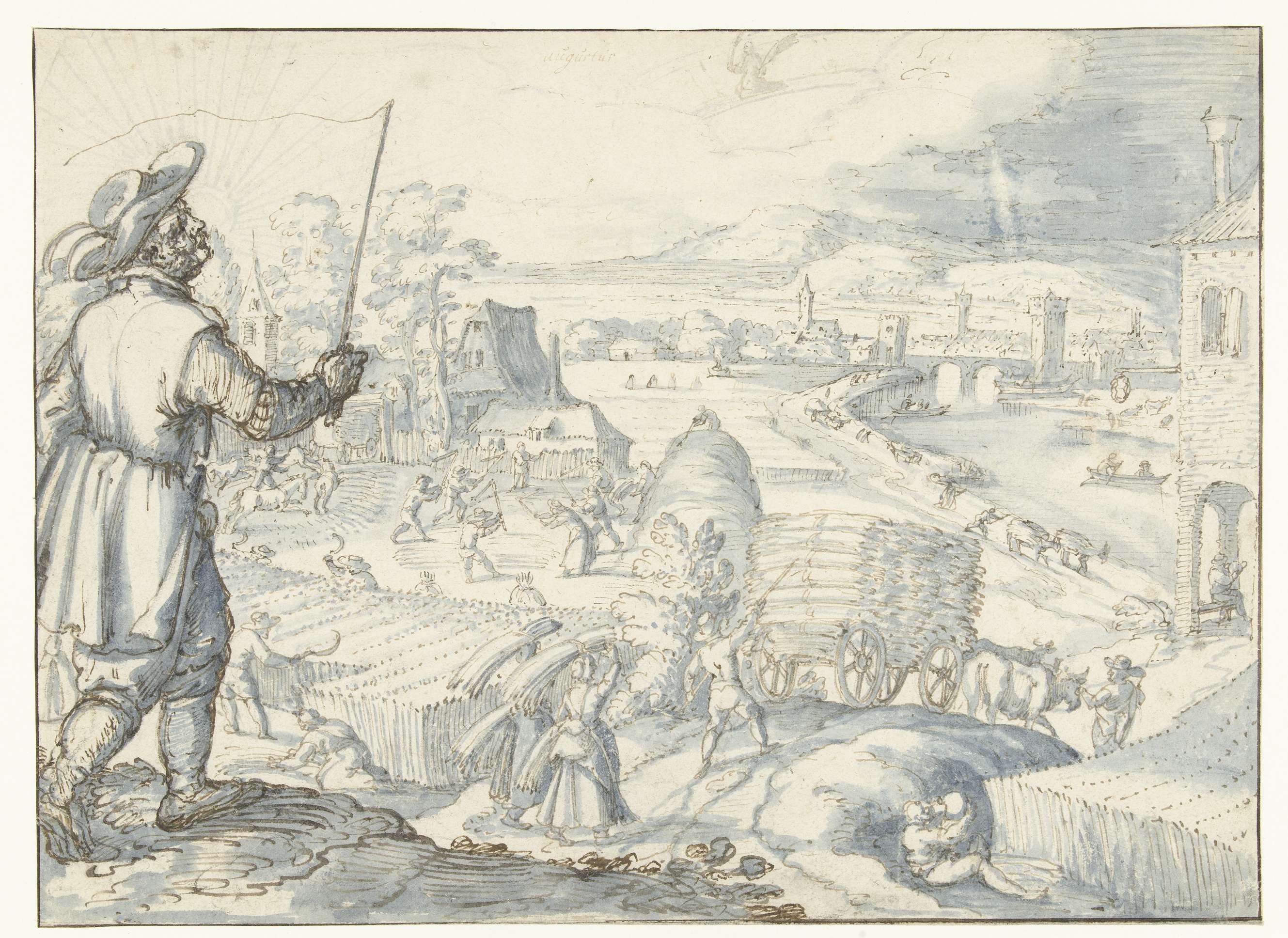 De maand augustus. Een voerman met een zweep, daarachter oogsten, transport en dorsen van het graan. Ontwerp voor een prent.