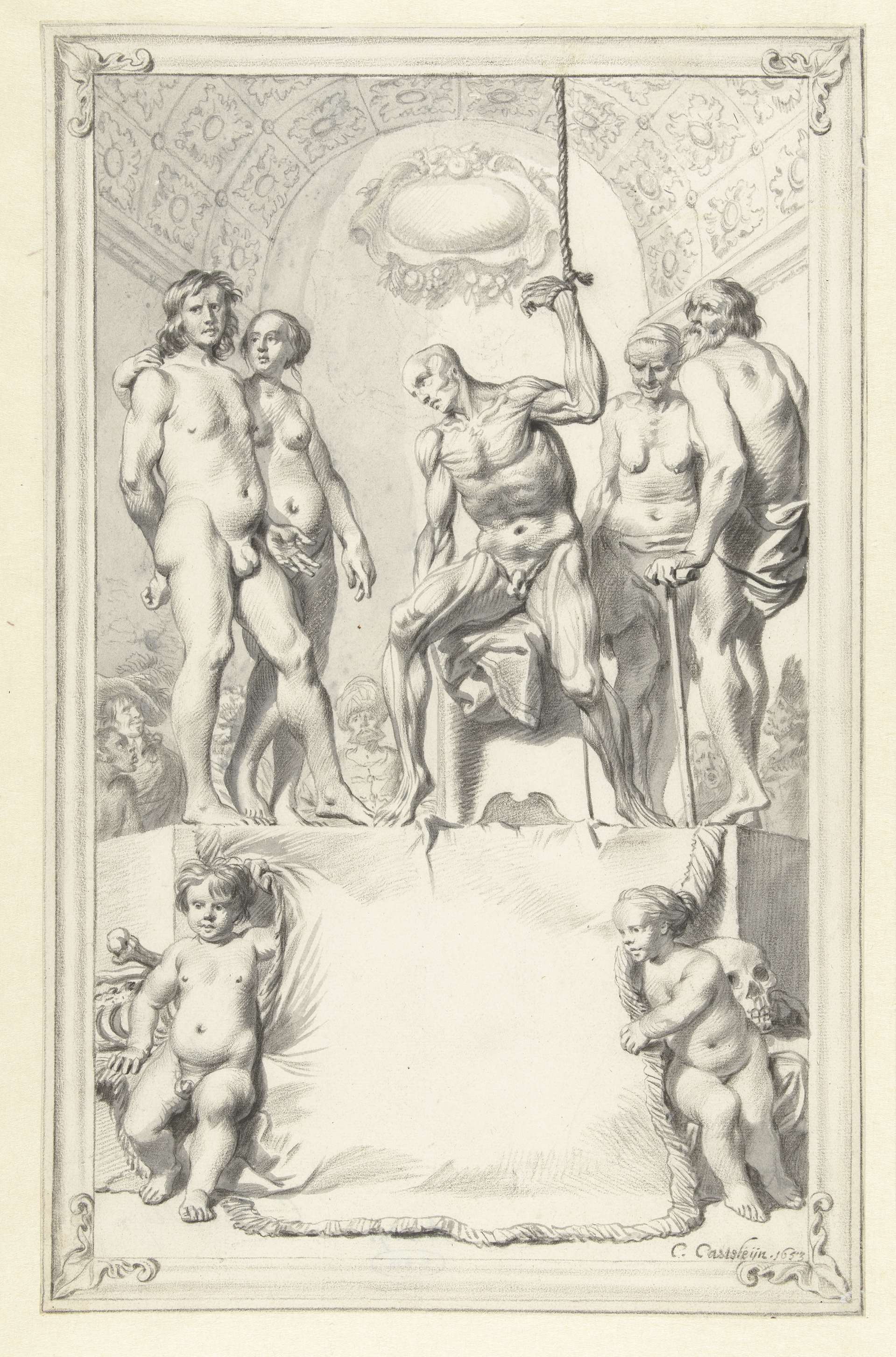 Een spiermodel, gepresenteerd als een levend mens, zit op een podium. Naast hem poseren een jonge man en vrouw en een oud paar. Daarachter kijkt allerlei publiek toe. Misschien is deze tekening gemaakt voor een geschreven boek van het Haarlemse Sint Lucasgilde, de beroepsvereniging van de kunstenaars. Casper Casteleyn was daar juist in 1653 lid ...