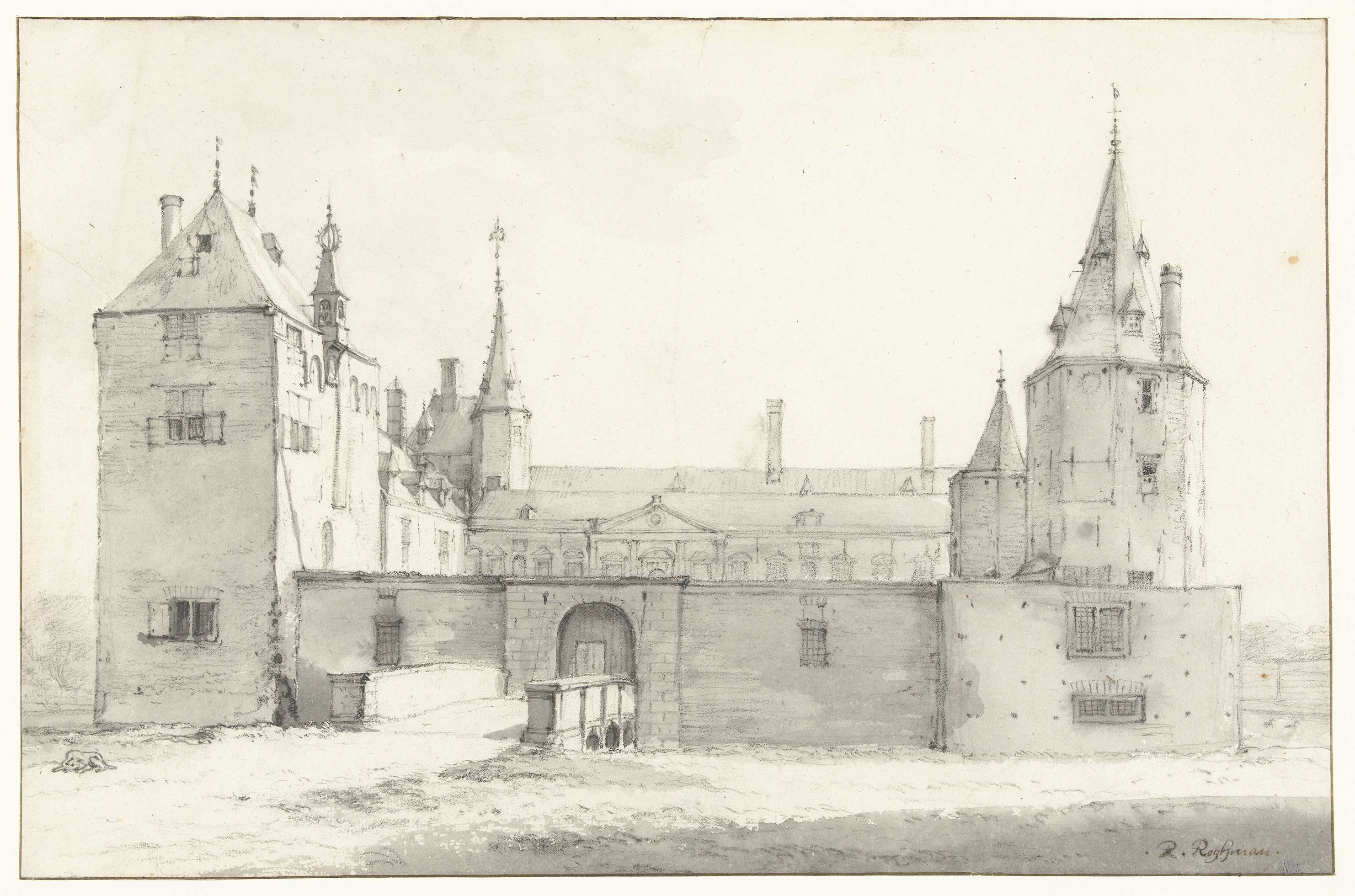 Roghman zette in deze tekening Huis Warmond neer als een machtige burcht. De twee imposante torens flankeren het in diverse bouwstijlen uitgevoerde kasteel. Door het gebouw zo groots neer te zetten, is de omgeving vrijwel weggelaten. Alleen de slapende hond op de voorgrond, een zwerfhond of misschien wel het huisdier van Jacob van Wassenaer Warmond ...