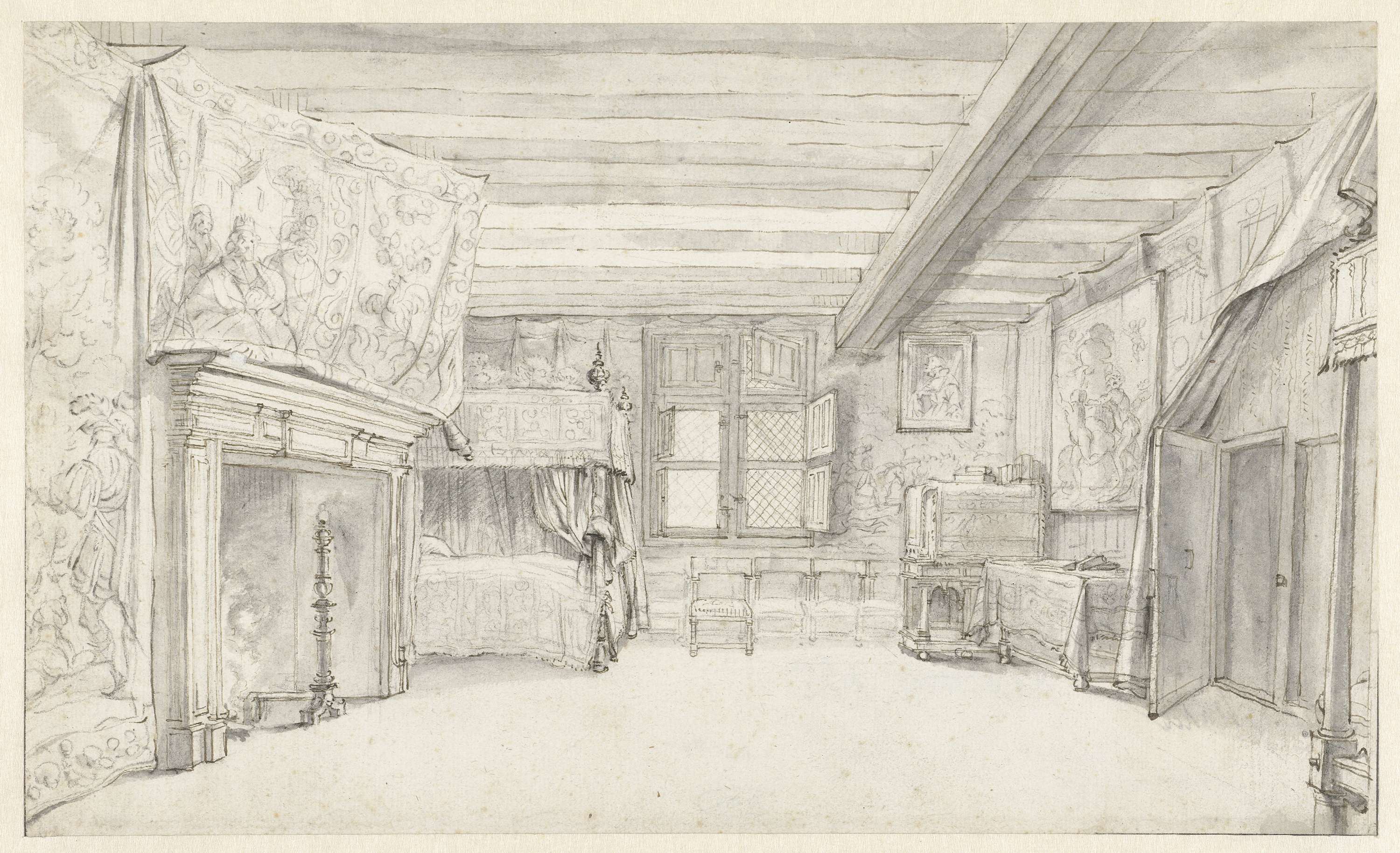 Een slaapkamer waarvan de muren met wandtapijten en schilderijen zijn behangen. Links een hemelbed, vier stoelen zijn tegen de wand onder het raam geschoven. Over de tafel tegen de rechterwand is een kleed gedrapeerd. Aan de andere kant van de kamer bevindt zich de schouw. Mogelijk het slaapvertrek van Maurits in het Stadhouderlijk Kwartier in ...