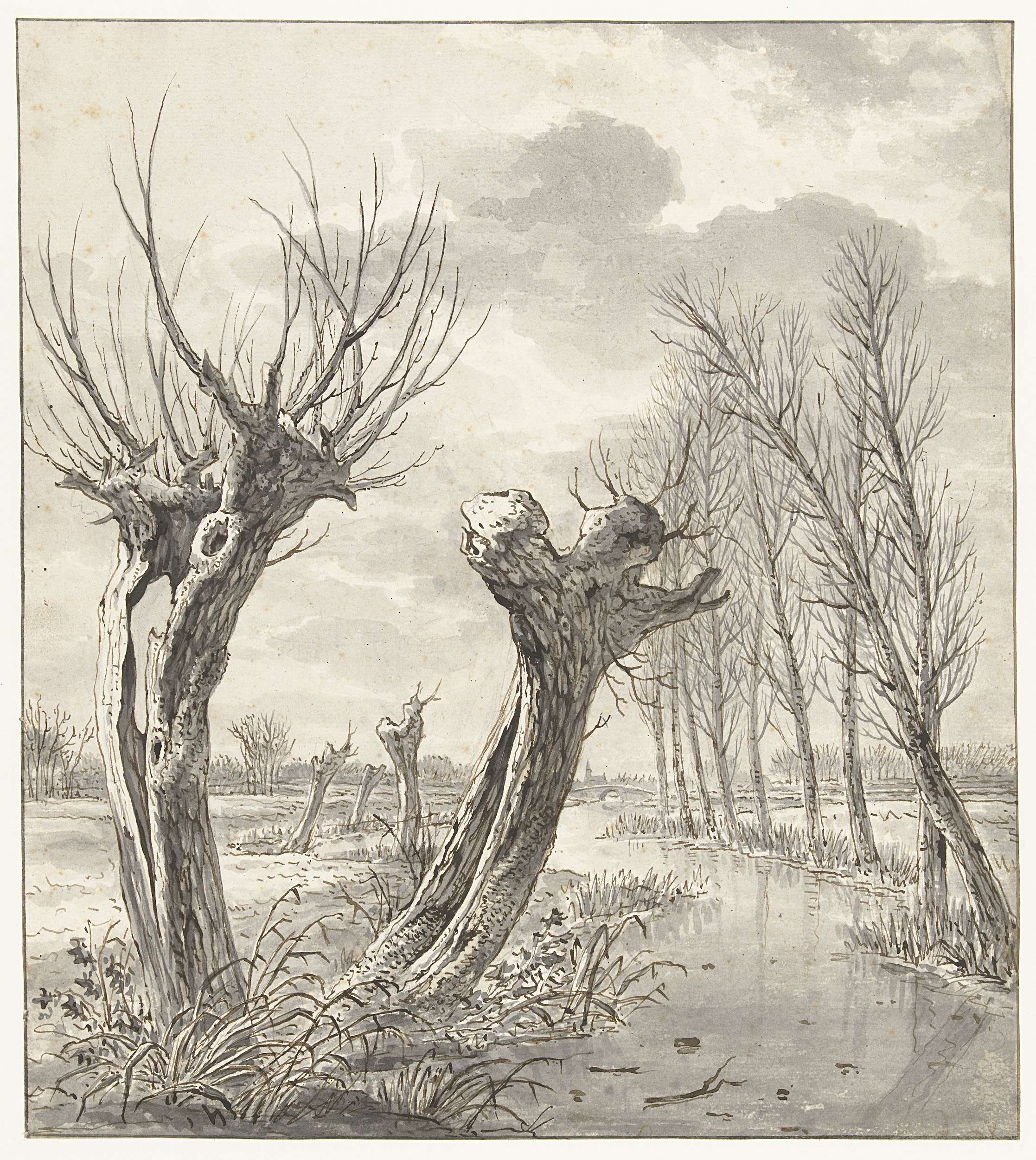 Winterlandschap met knotwilgen langs een bevroren sloot