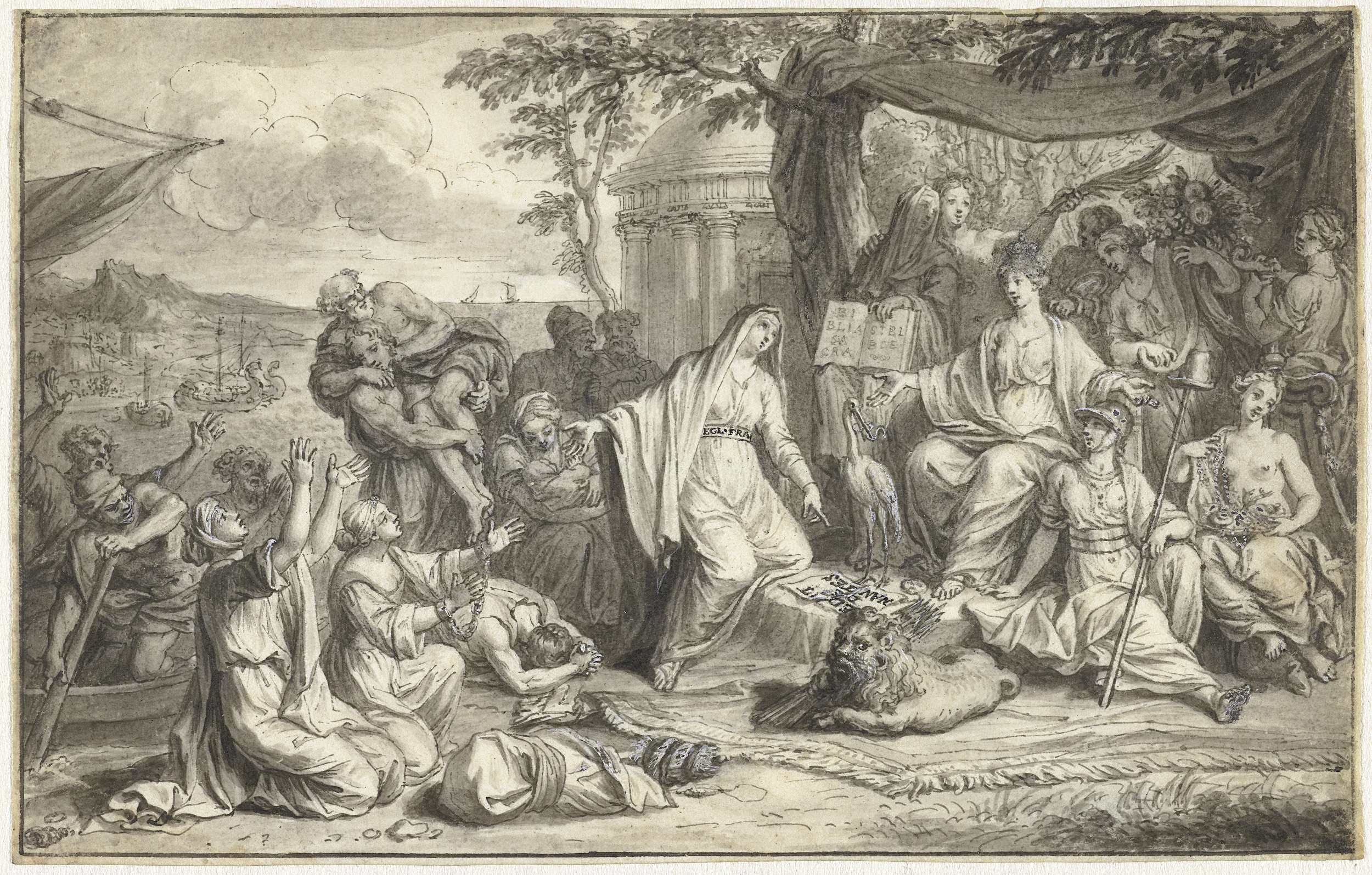 Allegorische voorstelling: de Nederlandse Republiek ontvangt (de leden van) de Franse protestantse kerk na de herroeping van het Edict van Nantes. Mogelijk ontwerp voor een prent.