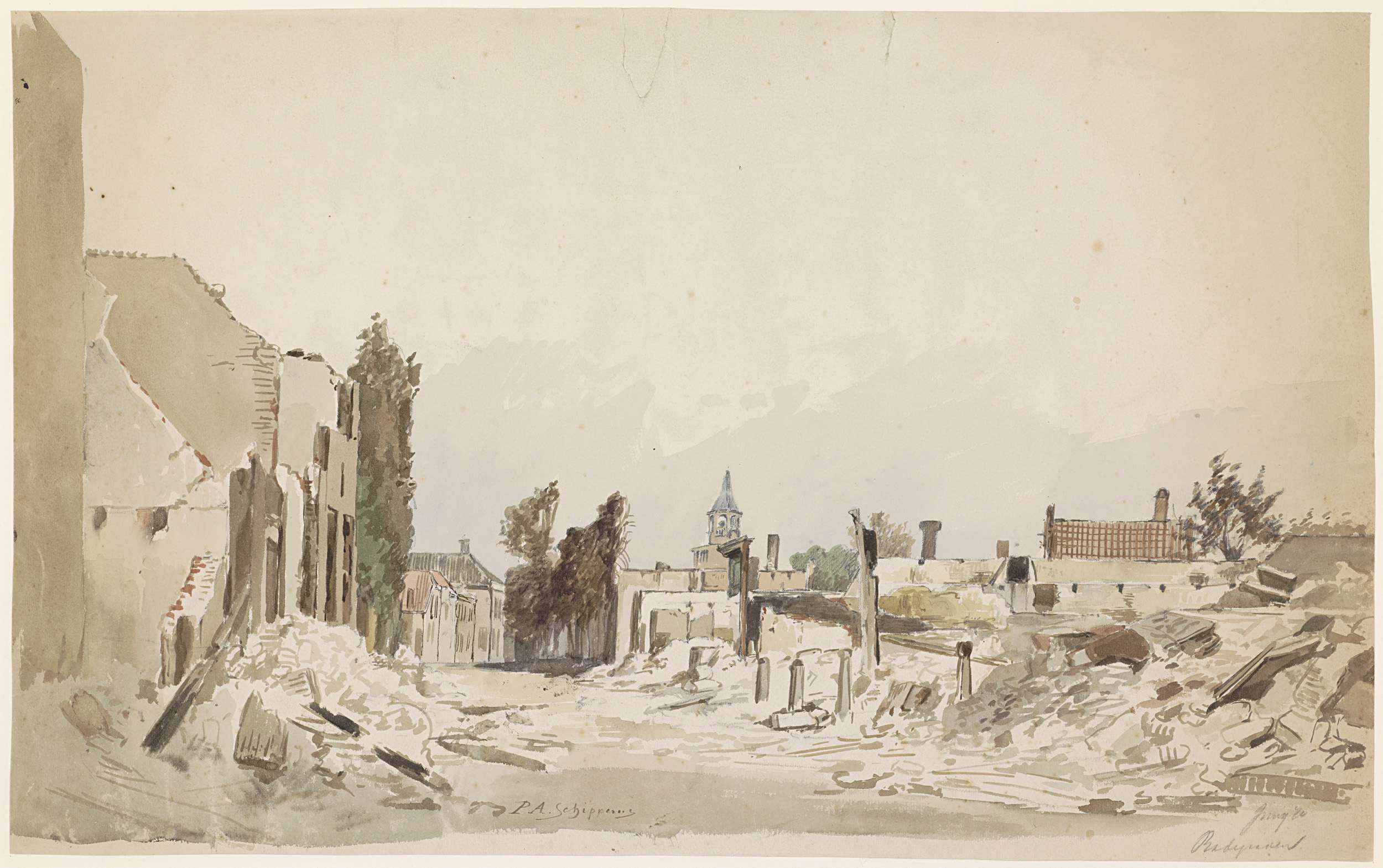 De ruïnes te Bodegraven na de brand van juni 1870