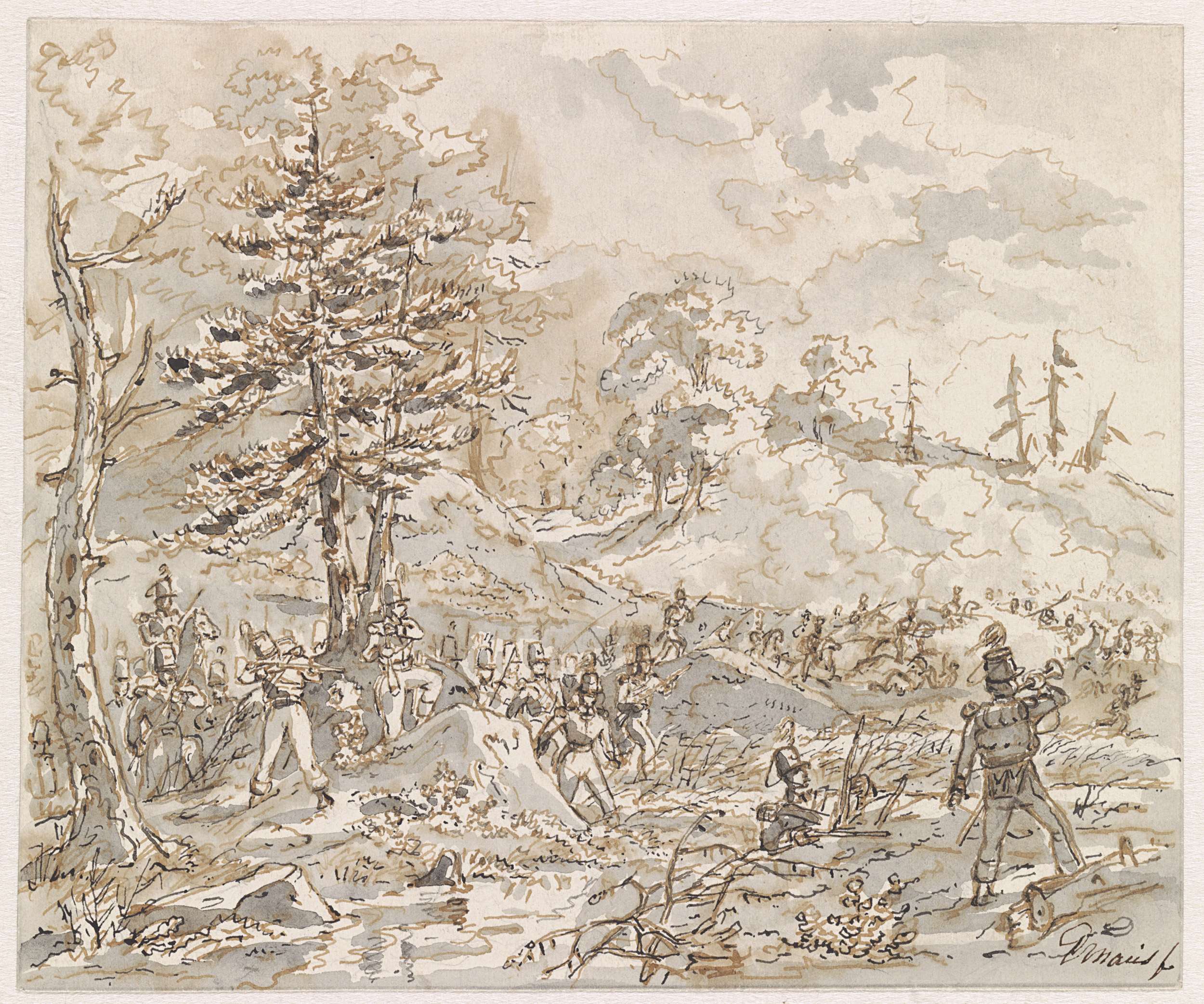 Gevecht tussen cavalerie en voetvolk in heuvellandschap