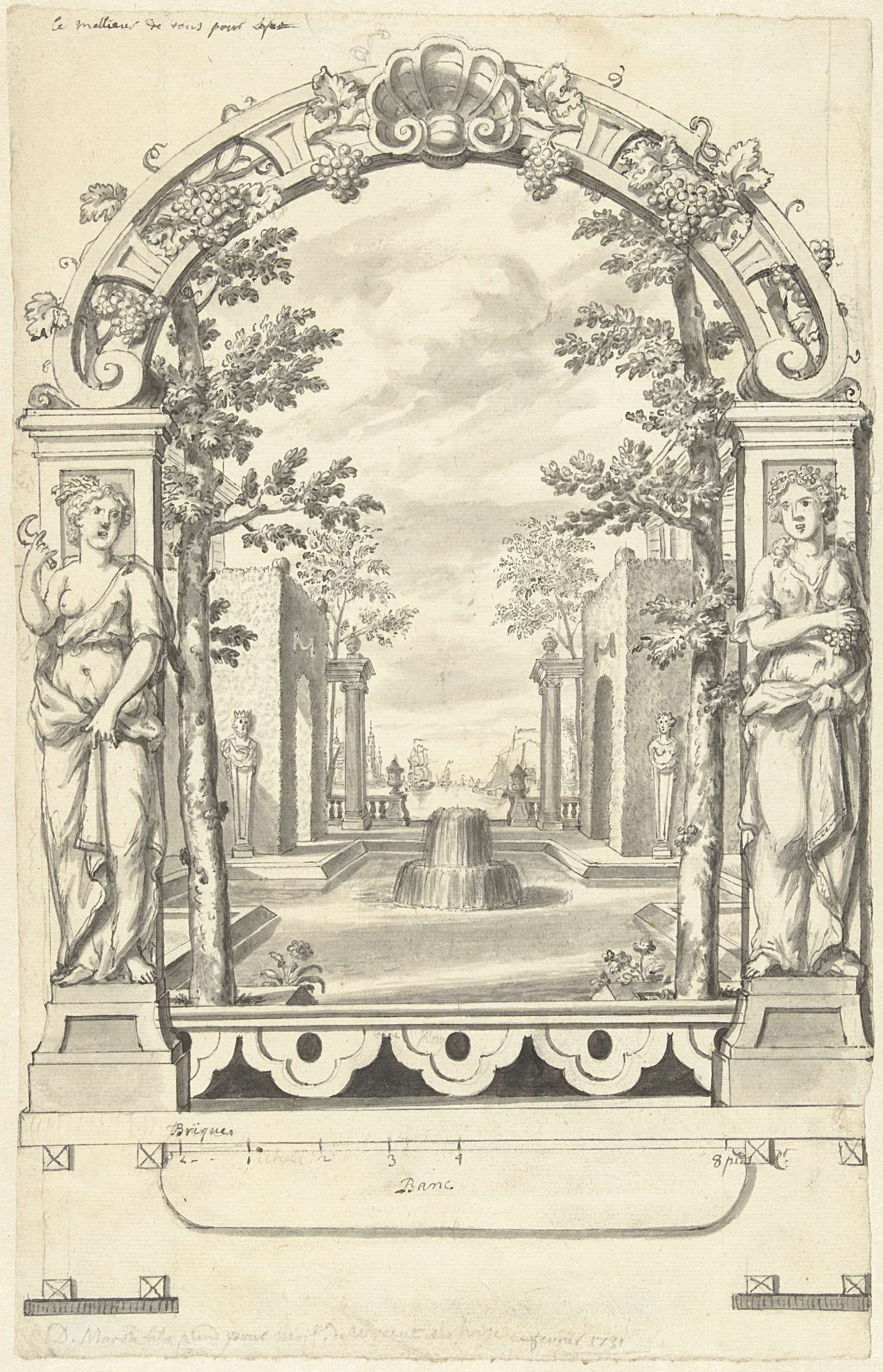 Ontwerp voor een decoratief paneel (wanddecoratie?) met uitzicht op een ornamentale tuin tussen twee standbeelden door.