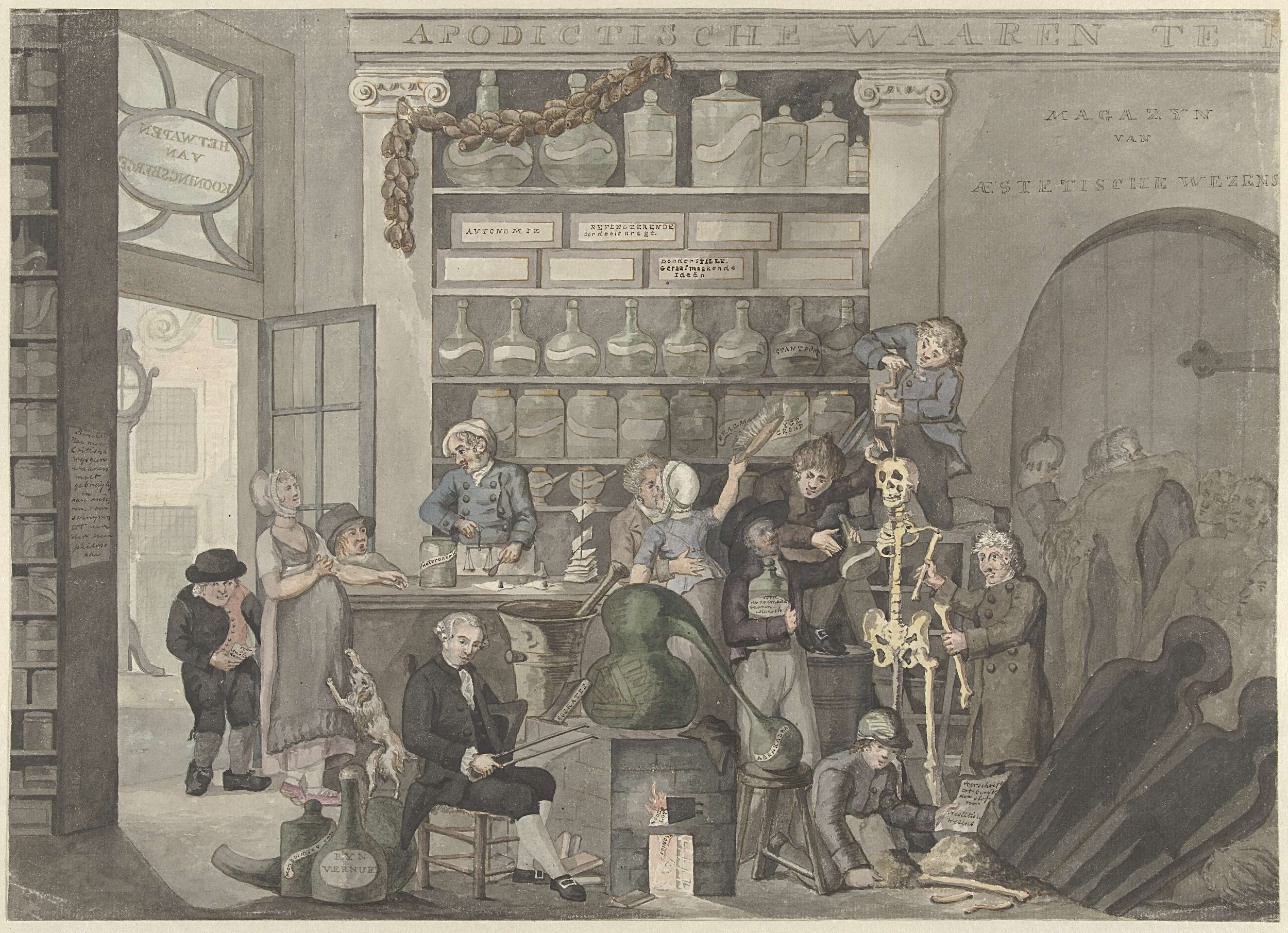 Spotprent op de filosofie van Kant. In een drukke apotheek wordt rechts een menselijk geraamte onderzocht en uiteengenomen; in het midden worden in een grote kolf filosofie-boeken omgekookt tot `abrakadra'.