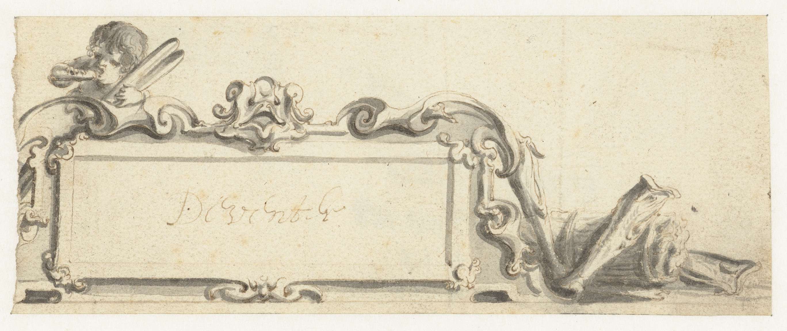 Deel van een cartouche met een masker en een figuur
