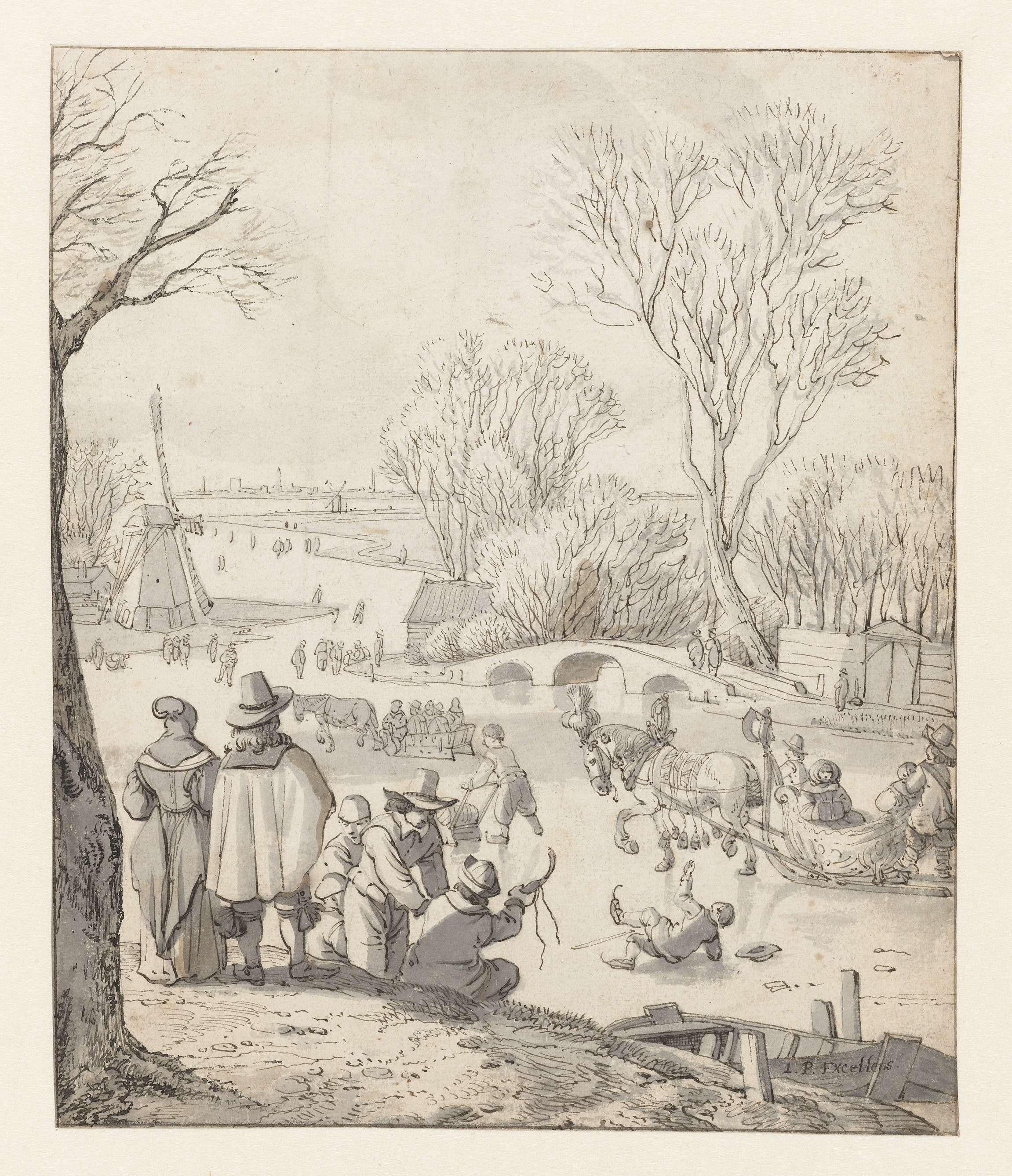 Gezicht op een bevroren rivier met mensen op schaatsen en in sleden.