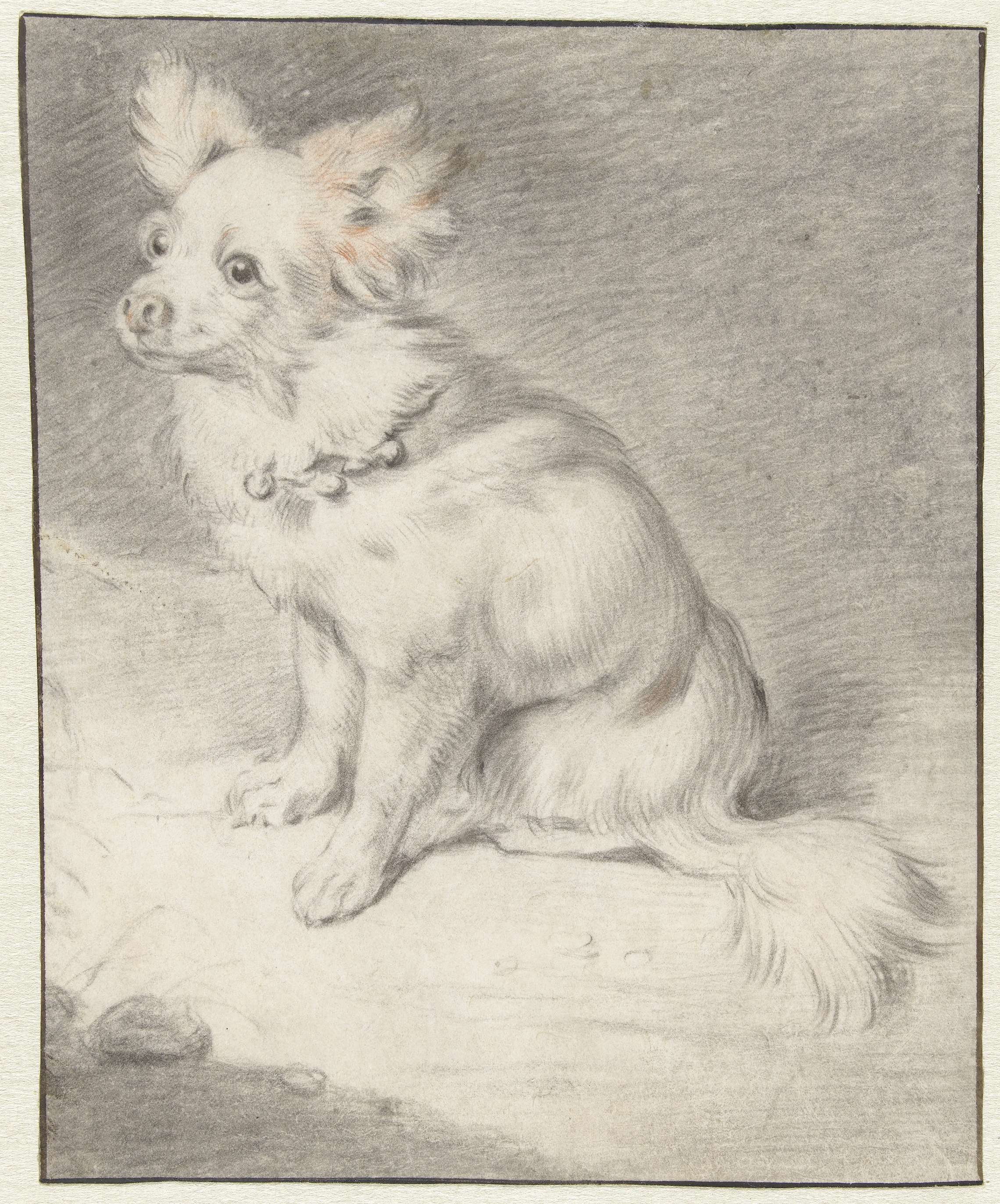 De Haarlemmer Cornelis Visscher tekende zijn dieren als zijn portretten van mensen: levendig en niet geïdealiseerd. Zo nam de kunstenaar de karakteristieke trekken van dit vlinderhondje over, zoals de bibberige houding en de uitpuilende oogjes. De tekening is een kopie naar een blad in de verzameling Frits Lugt in Parijs. Mogelijk waren beide uitgewerkte tekeningen ...