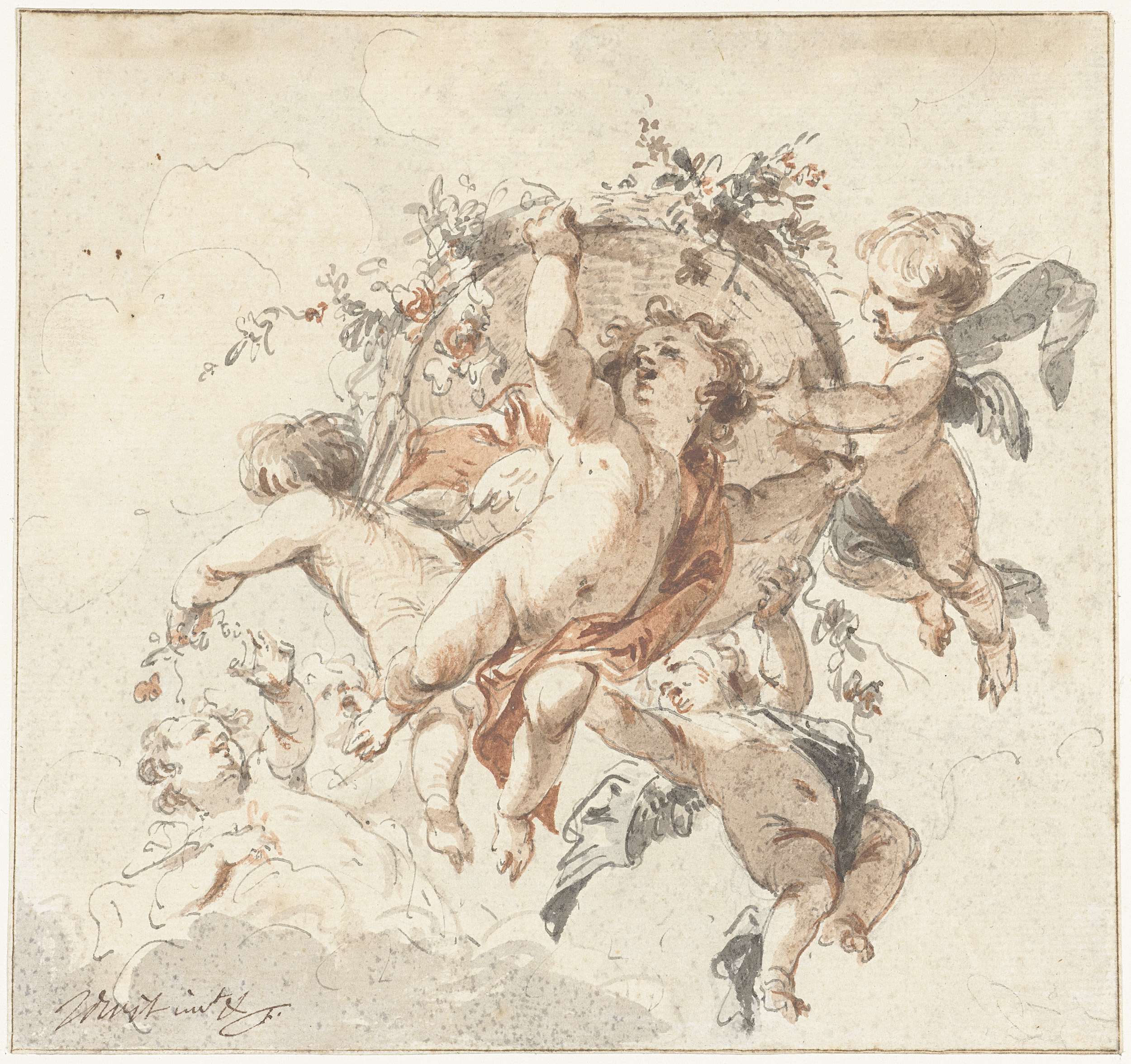 Zwevende cherubijnen met een bloemenmand