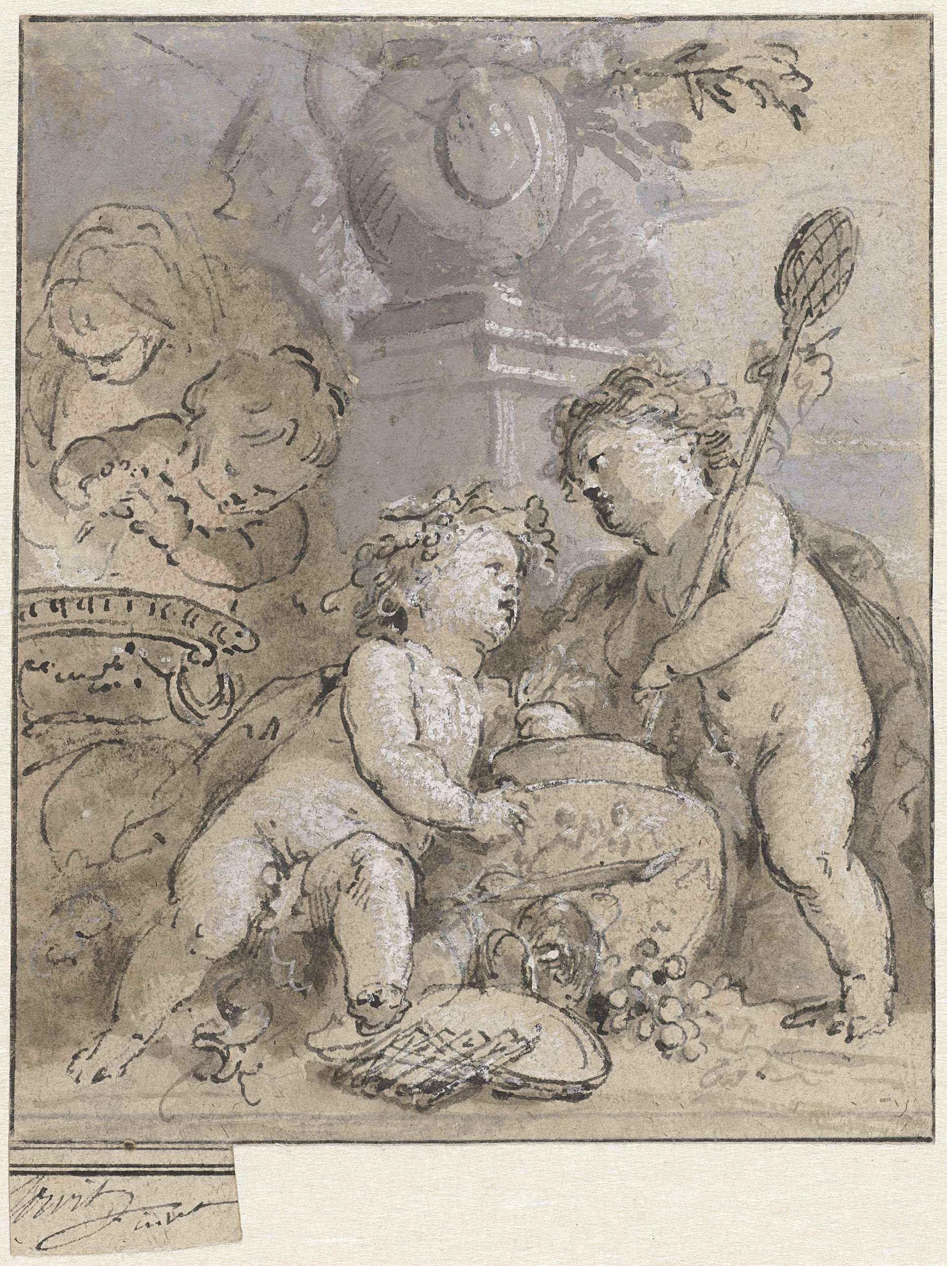 Rechts twee putti met een bloemenvaas en thyrsus. Links warmen twee putti zich bij een vuur. Ontwerp voor een decoartie.