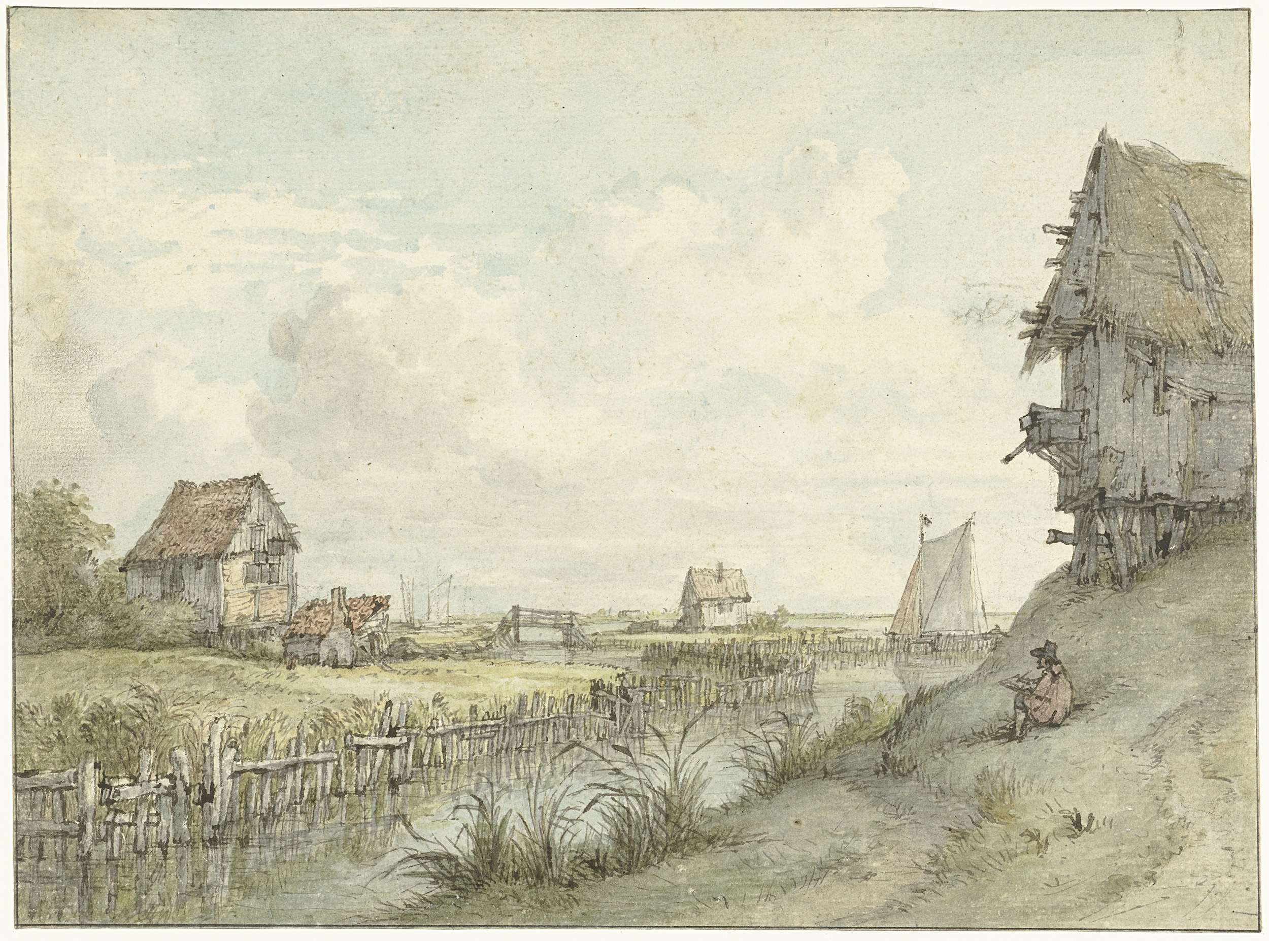 Rivierlandschap met schetsende tekenaar tussen hutjes